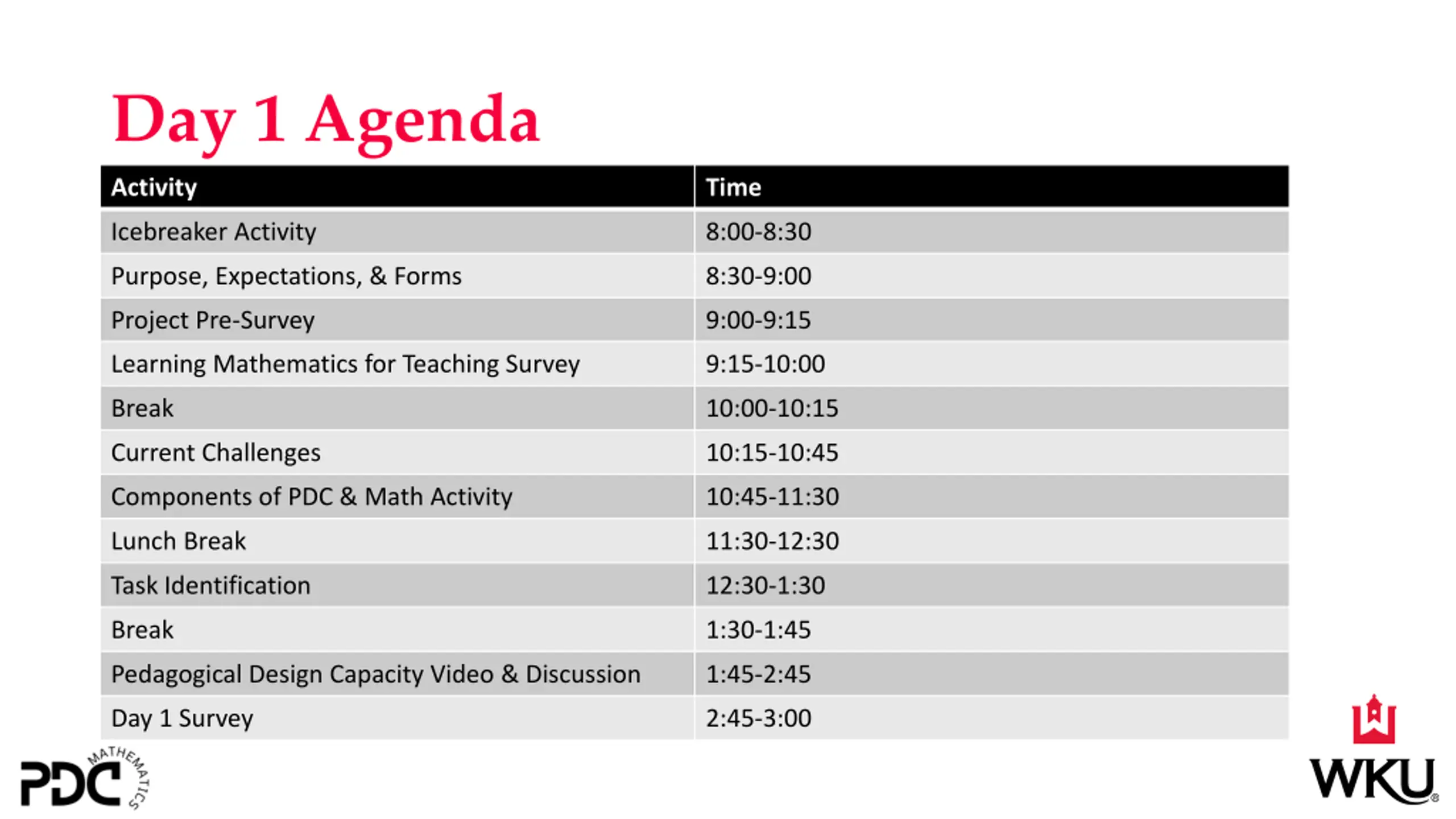 Day 1 Agenda Activity Time Icebreaker Activity 8:00-8:30 Purpose, Expectations, & Forms 8:30-9:00 Project Pre-Survey 9:00-9:15 Learning Mathematics for Teaching Survey 9:15-10:00 Break 10:00-10:15 Current Challenges 10:15-10:45 Components of PDC & Math Activity 10:45-11:30 Lunch Break 11:30-12:30 Task Identification 12:30-1:30 Break 1:30-1:45 Pedagogical Design Capacity Video & Discussion 1:45-2:45 Day 1 Survey 2:45-3:00