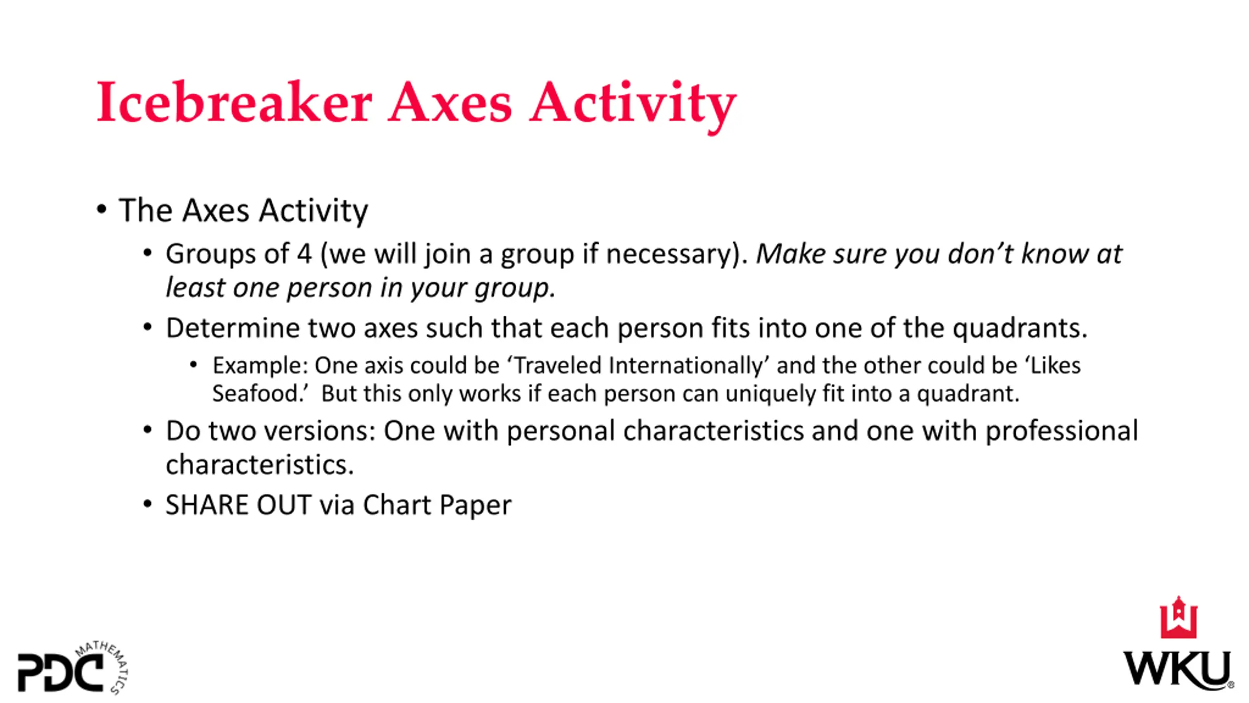 Icebreaker Axes Activity The Axes Activity Groups of 4 (we will join a group if necessary). Make sure you don t know at least one person in your group. Determine two axes such that each person fits into one of the quadrants. Example: One axis could be Traveled Internationally and the other could be Likes Seafood. But this only works if each person can uniquely fit into a quadrant. Do two versions: One with personal characteristics and one with professional characteristics. SHARE OUT via Chart Paper