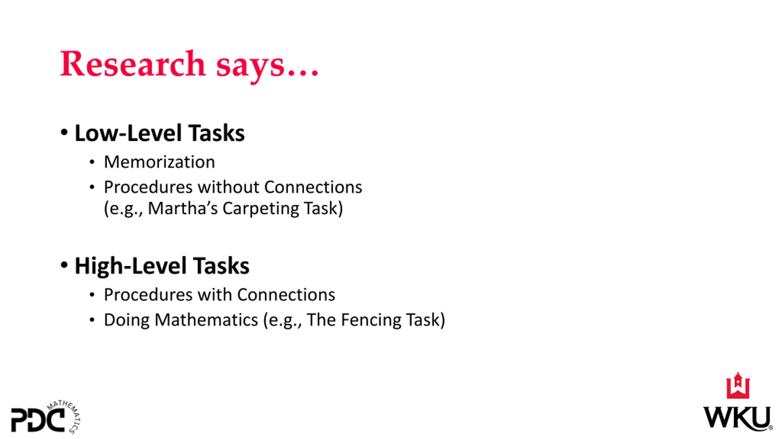 Research says Low-Level Tasks Memorization Procedures without Connections (e.g., Martha s Carpeting Task) High-Level Tasks Procedures with Connections Doing Mathematics (e.g., The Fencing Task)