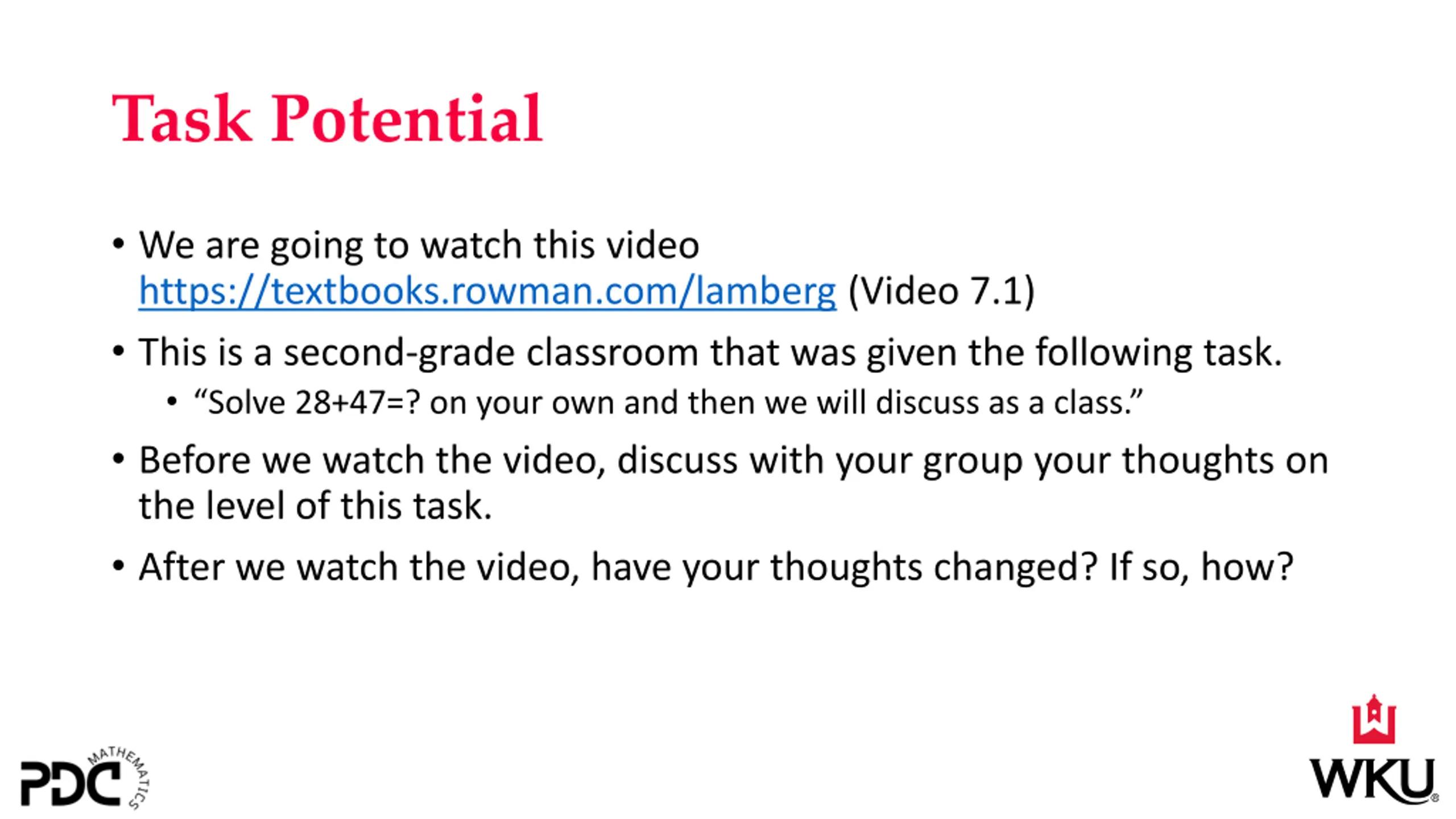 Task Potential We are going to watch this video https://textbooks.rowman.com/lamberg (Video 7.1) This is a second-grade classroom that was given the following task. Solve 28+47=? on your own and then we will discuss as a class. Before we watch the video, discuss with your group your thoughts on the level of this task. After we watch the video, have your thoughts changed? If so, how?