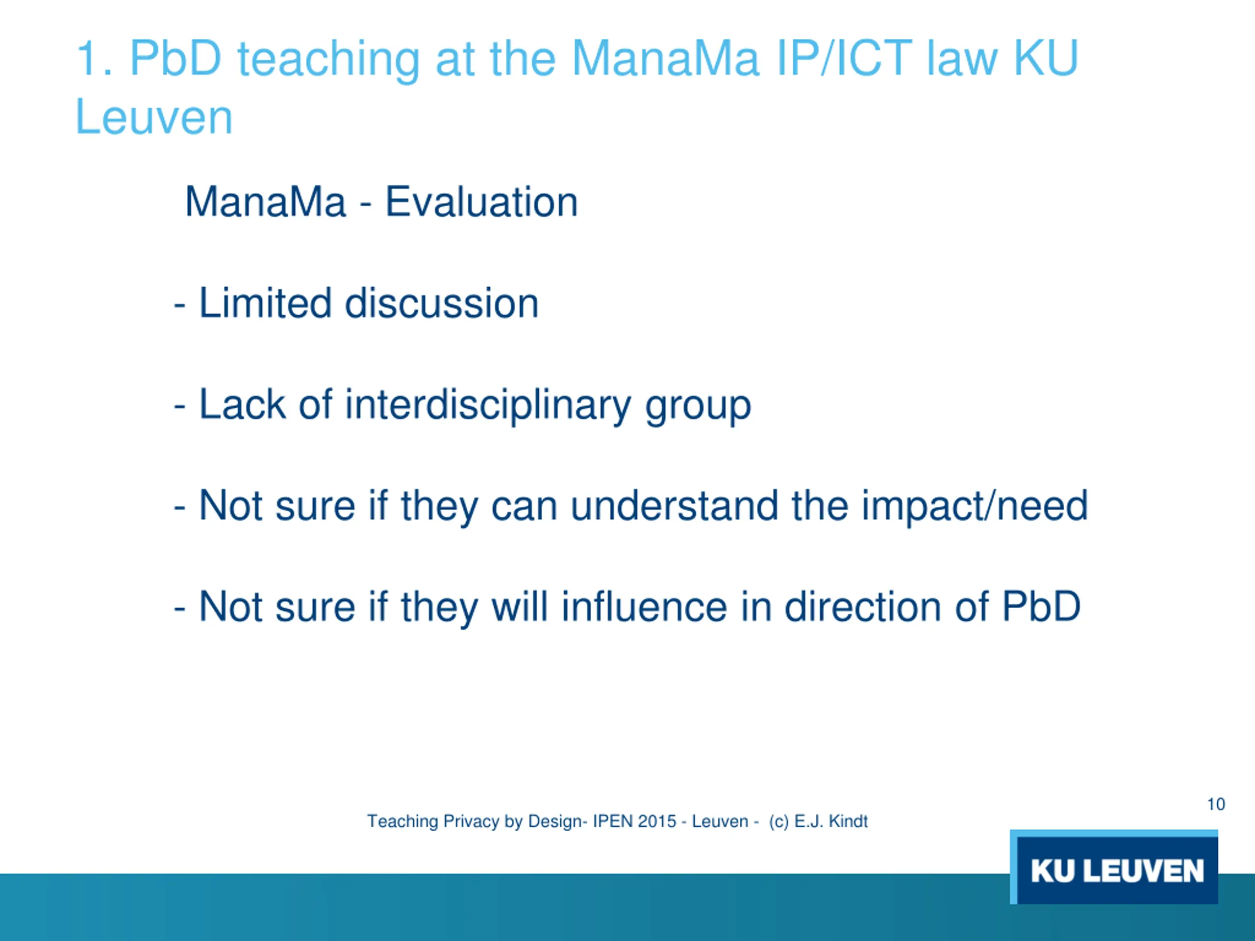 1. PbD teaching at the ManaMa IP/ICT law KU Leuven ManaMa - Evaluation - Limited discussion - Lack of interdisciplinary group - Not sure if they can understand the impact/need - Not sure if they will influence in direction of PbD 10 Teaching Privacy by Design- IPEN 2015 - Leuven - (c) E.J. Kindt