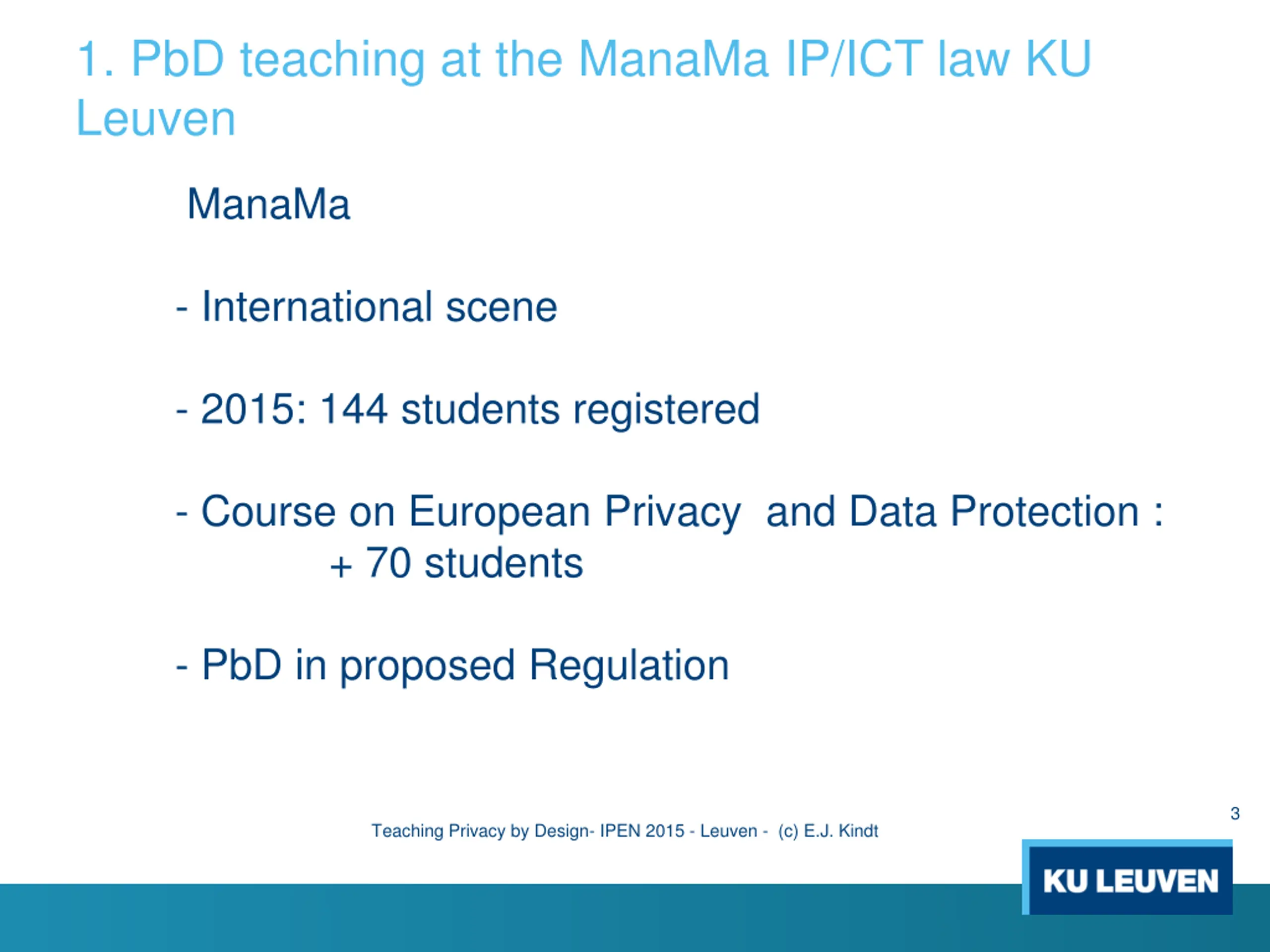 1. PbD teaching at the ManaMa IP/ICT law KU Leuven ManaMa - International scene - 2015: 144 students registered - Course on European Privacy and Data Protection : + 70 students - PbD in proposed Regulation 3 Teaching Privacy by Design- IPEN 2015 - Leuven - (c) E.J. Kindt
