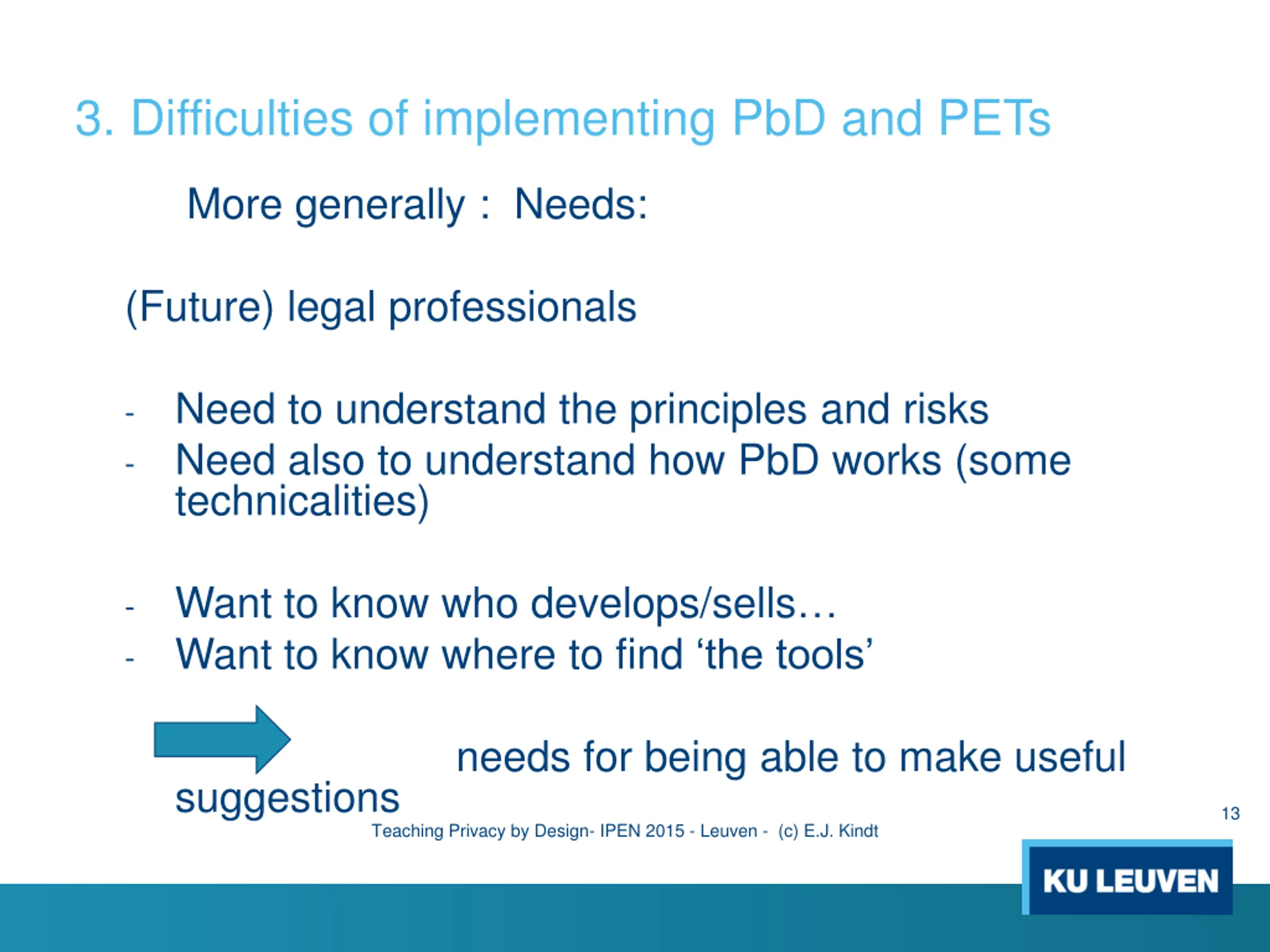 3. Difficulties of implementing PbD and PETs More generally : Needs: (Future) legal professionals Need to understand the principles and risks Need also to understand how PbD works (some technicalities) - - Want to know who develops/sells Want to know where to find the tools - - suggestions needs for being able to make useful 13 Teaching Privacy by Design- IPEN 2015 - Leuven - (c) E.J. Kindt