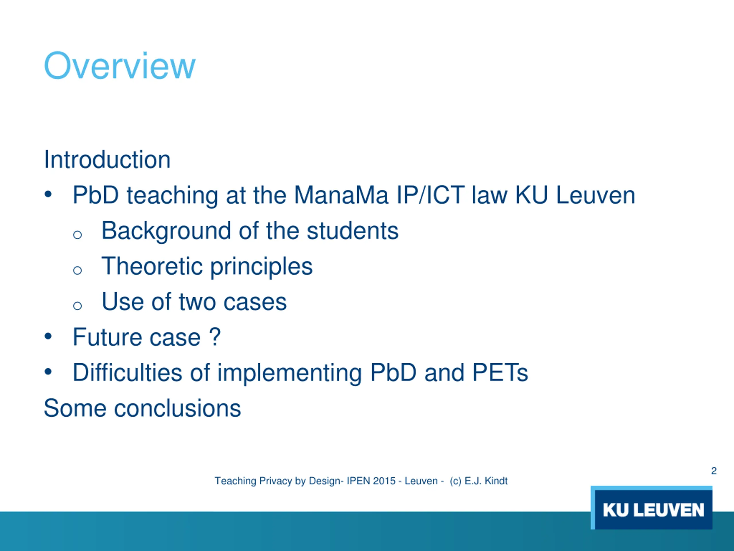 Overview Introduction PbD teaching at the ManaMa IP/ICT law KU Leuven o Background of the students o Theoretic principles o Use of two cases Future case ? Difficulties of implementing PbD and PETs Some conclusions 2 Teaching Privacy by Design- IPEN 2015 - Leuven - (c) E.J. Kindt