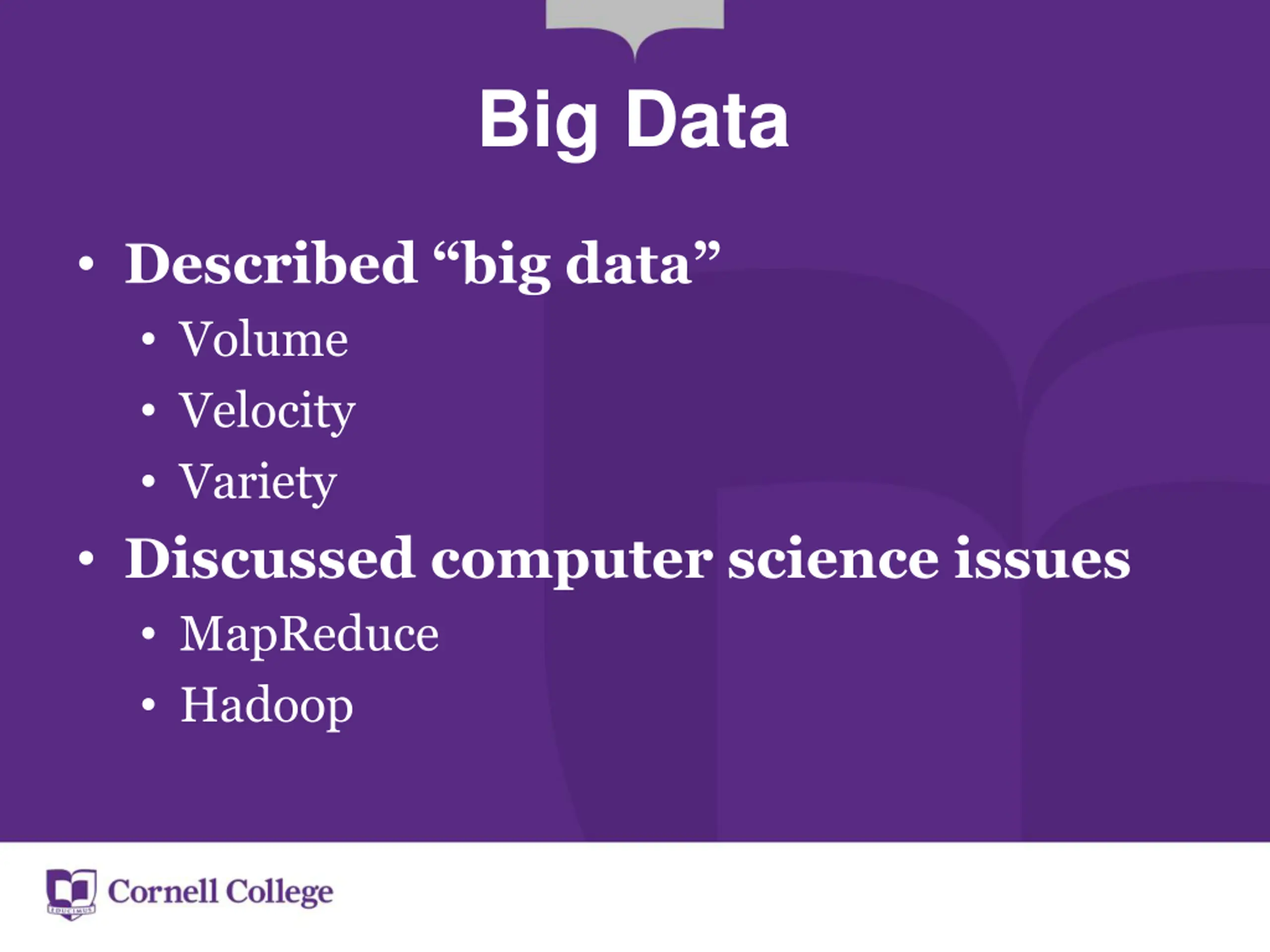 Big Data Described big data Volume Velocity Variety Discussed computer science issues MapReduce Hadoop