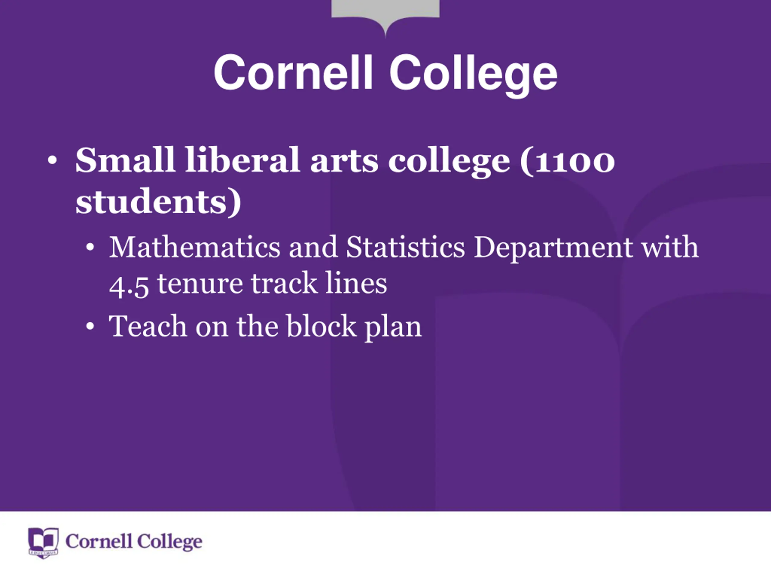 Cornell College Small liberal arts college (1100 students) Mathematics and Statistics Department with 4.5 tenure track lines Teach on the block plan