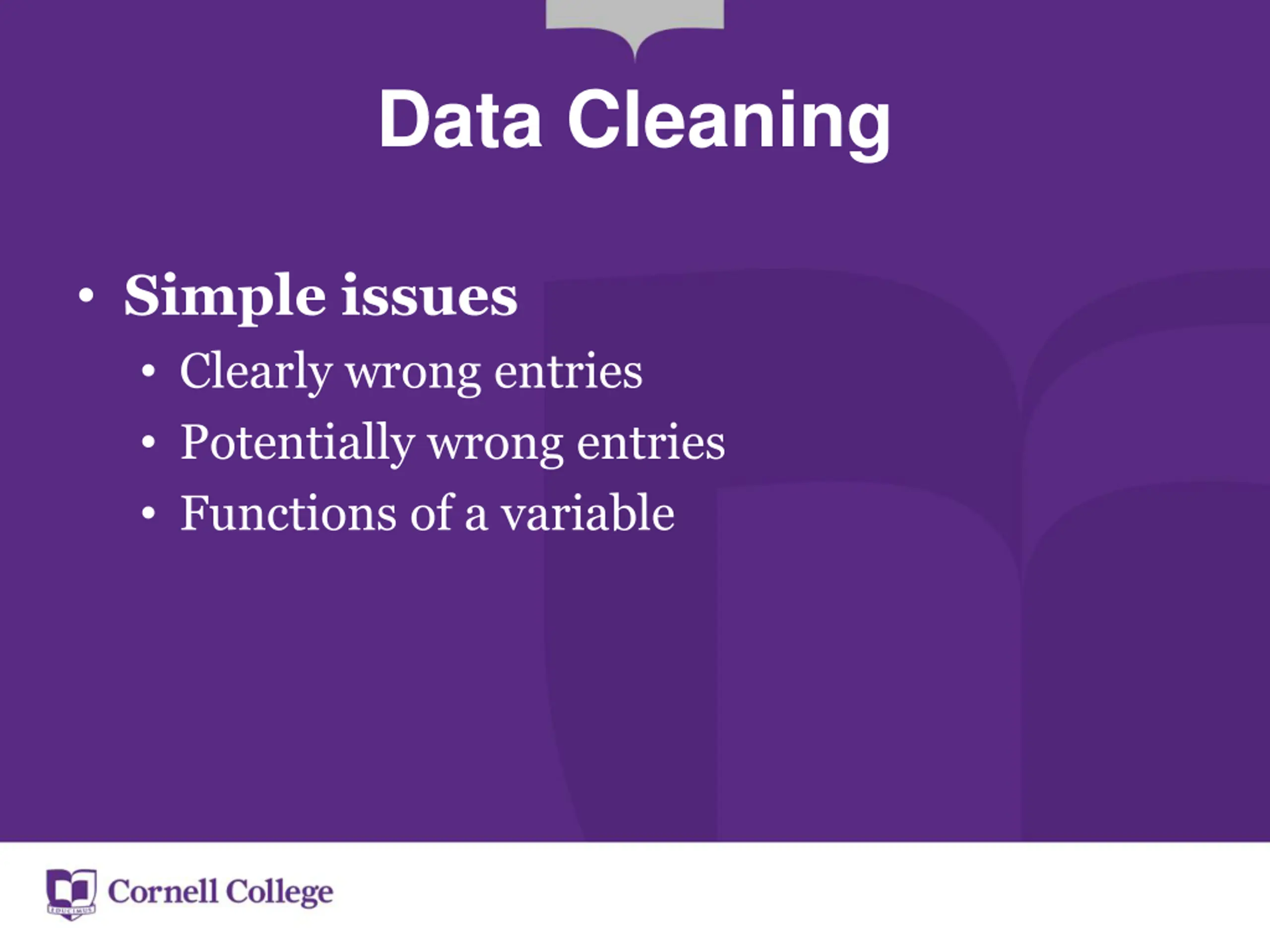 Data Cleaning Simple issues Clearly wrong entries Potentially wrong entries Functions of a variable