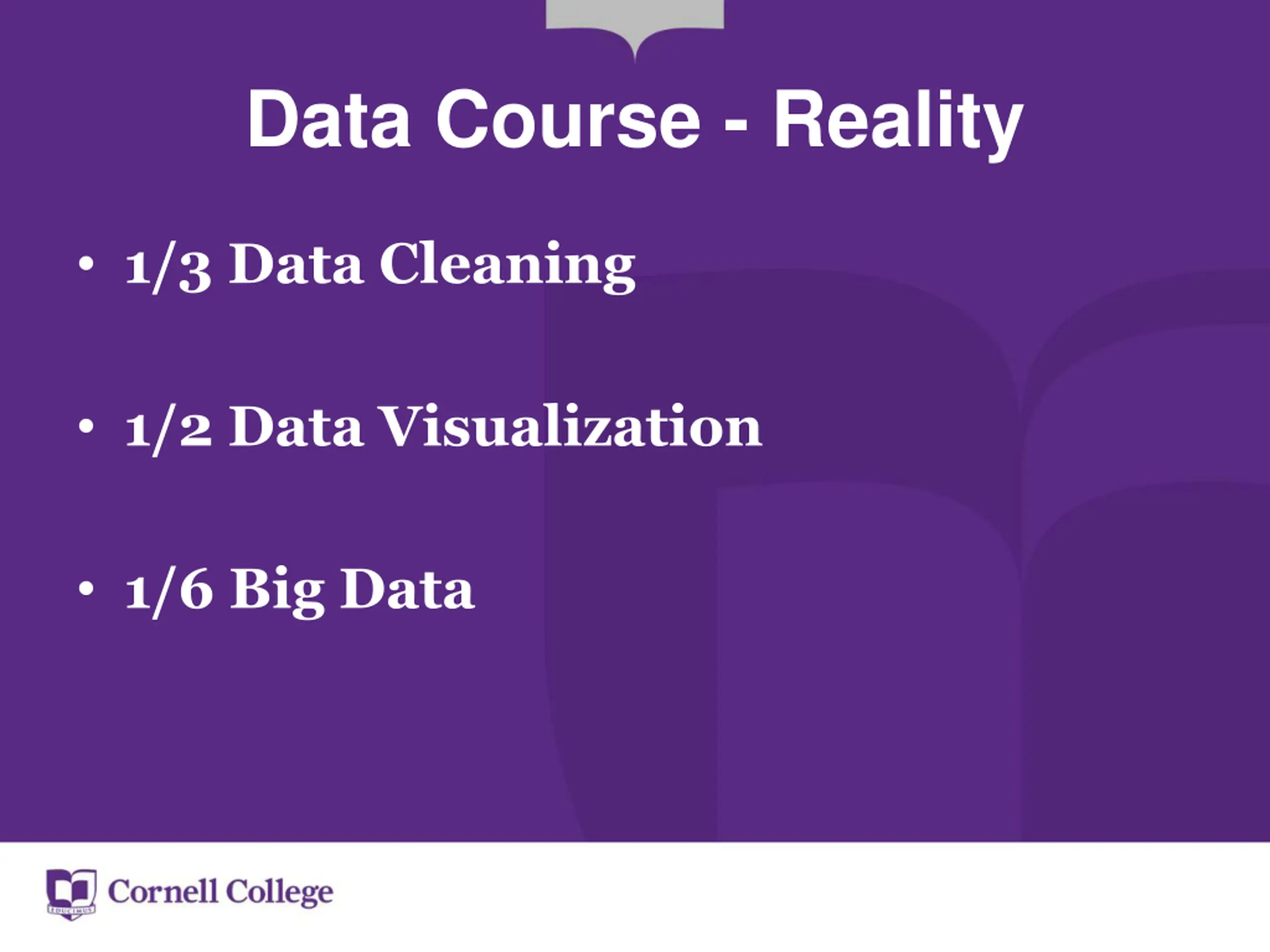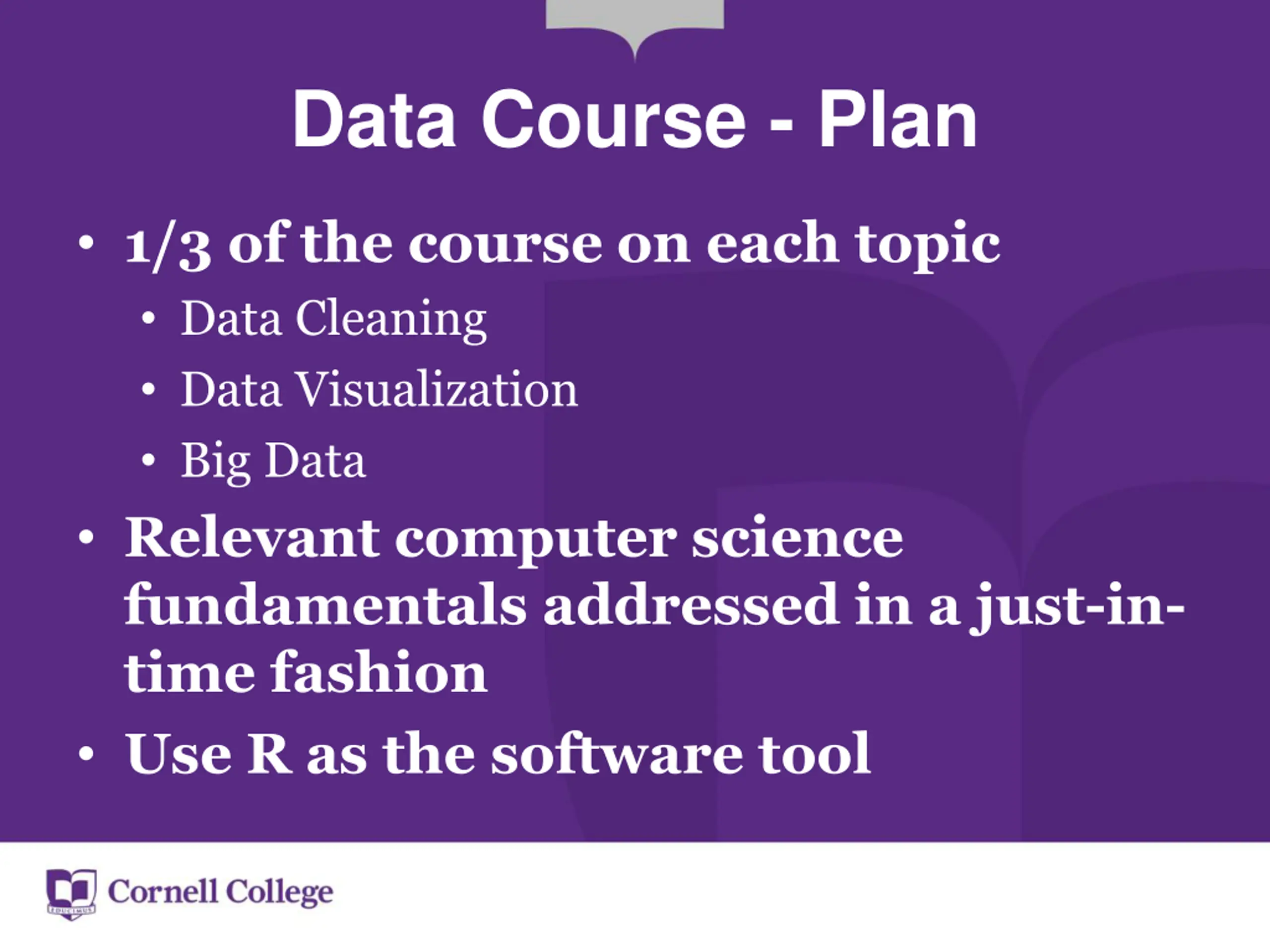 Data Course - Plan 1/3 of the course on each topic Data Cleaning Data Visualization Big Data Relevant computer science fundamentals addressed in a just-in- time fashion Use R as the software tool