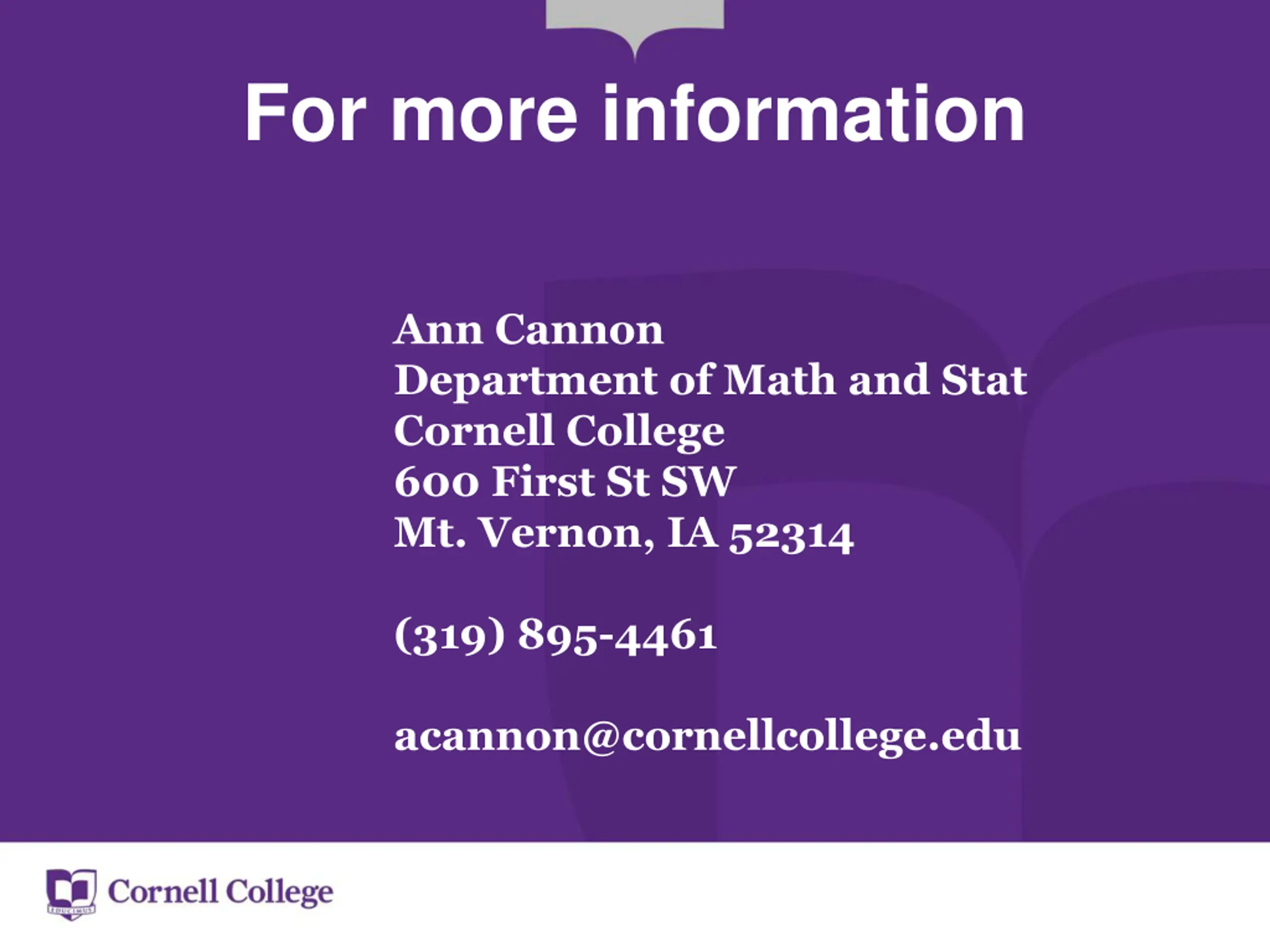 For more information Ann Cannon Department of Math and Stat Cornell College 600 First St SW Mt. Vernon, IA 52314 (319) 895-4461 acannon@cornellcollege.edu