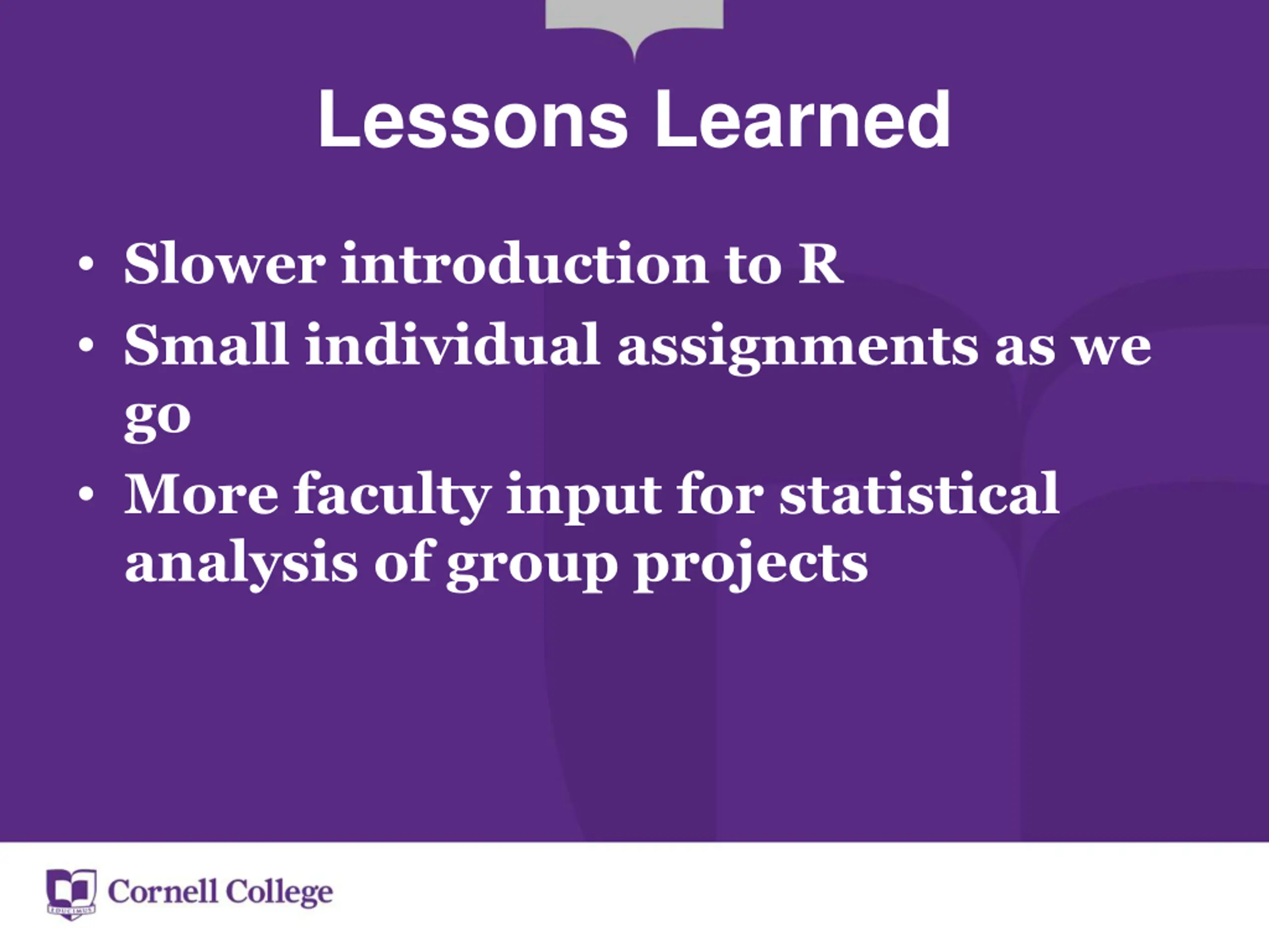 Lessons Learned Slower introduction to R Small individual assignments as we go More faculty input for statistical analysis of group projects