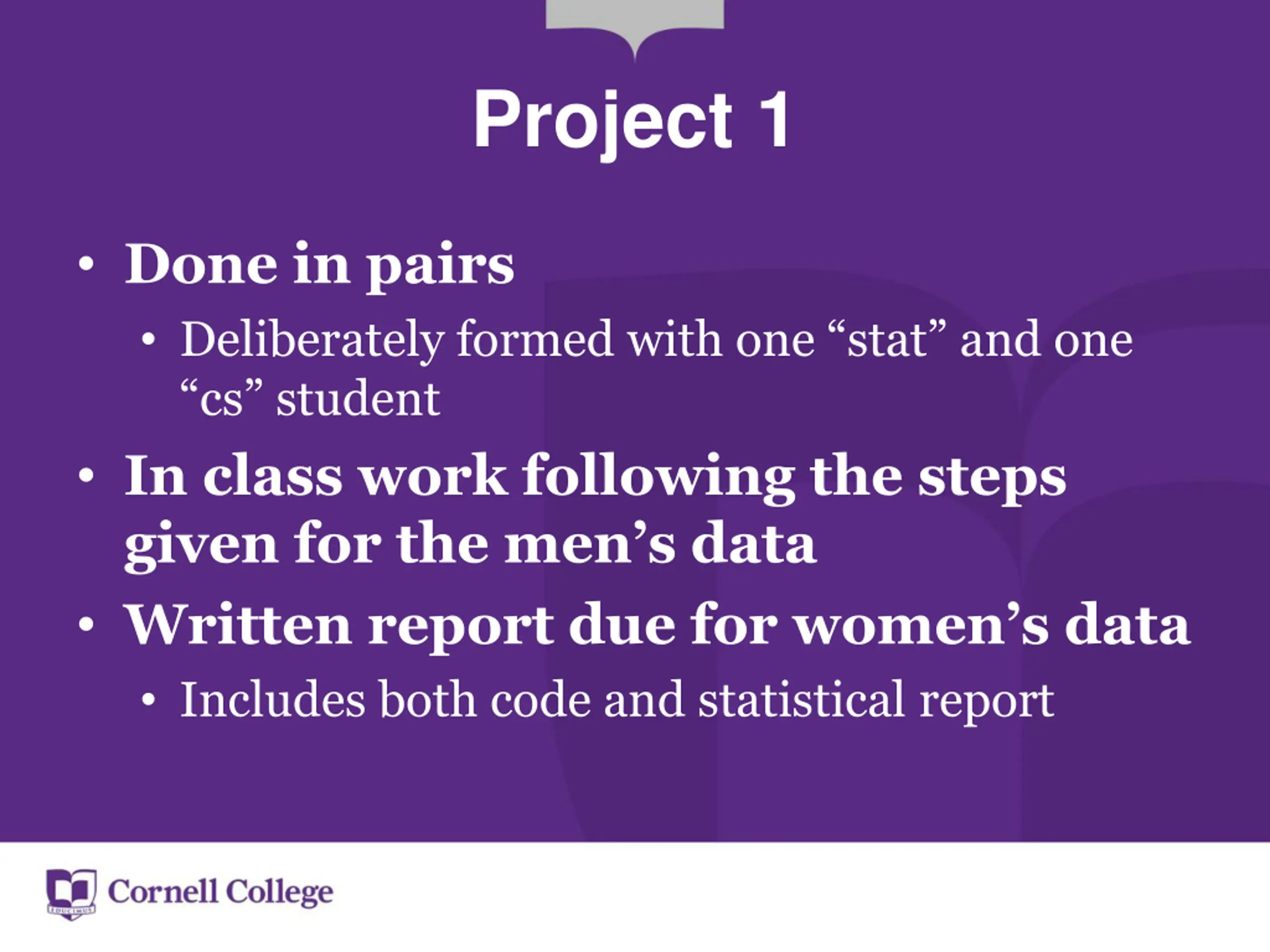 Project 1 Done in pairs Deliberately formed with one stat and one cs student In class work following the steps given for the men s data Written report due for women s data Includes both code and statistical report