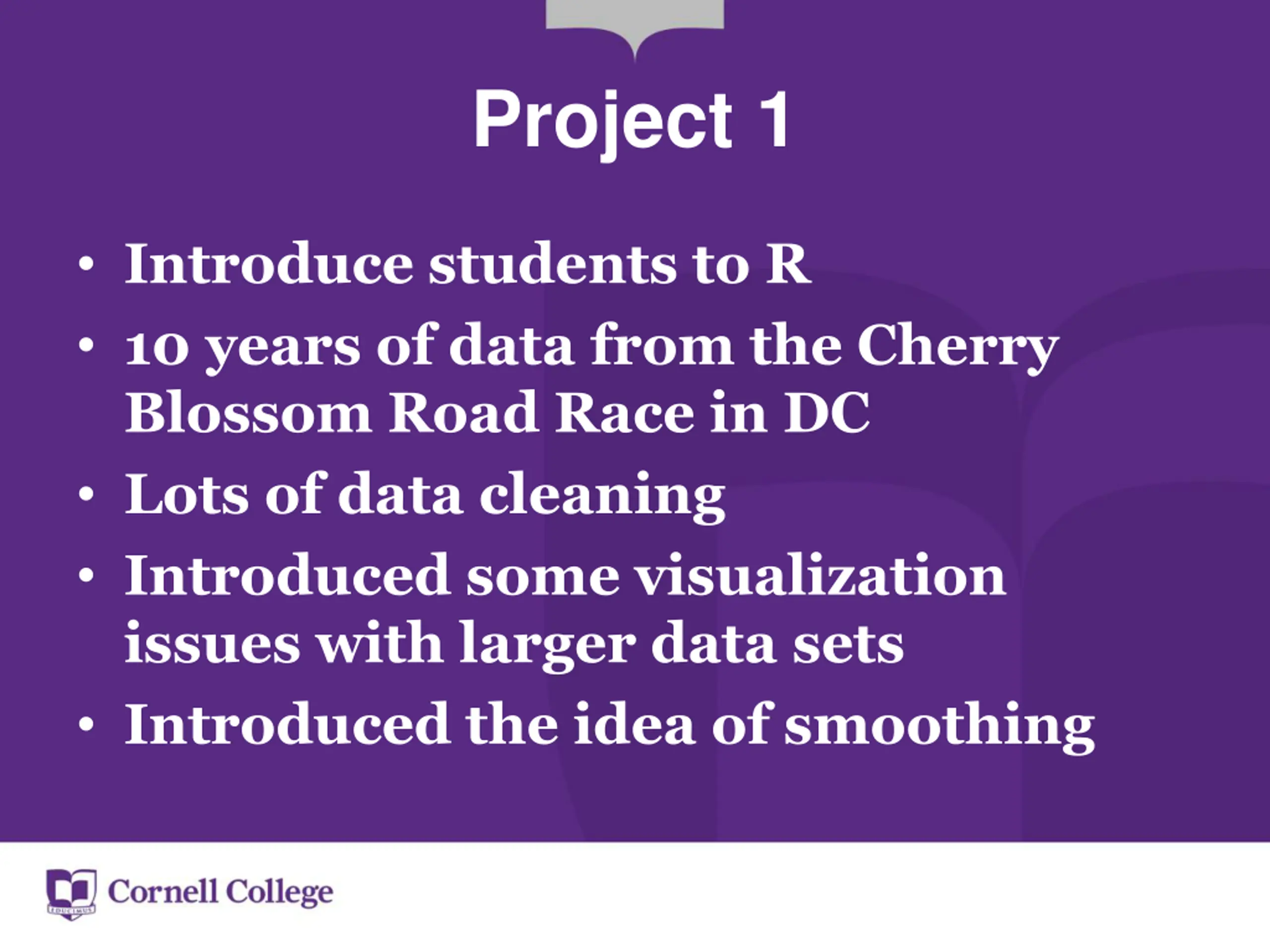 Project 1 Introduce students to R 10 years of data from the Cherry Blossom Road Race in DC Lots of data cleaning Introduced some visualization issues with larger data sets Introduced the idea of smoothing