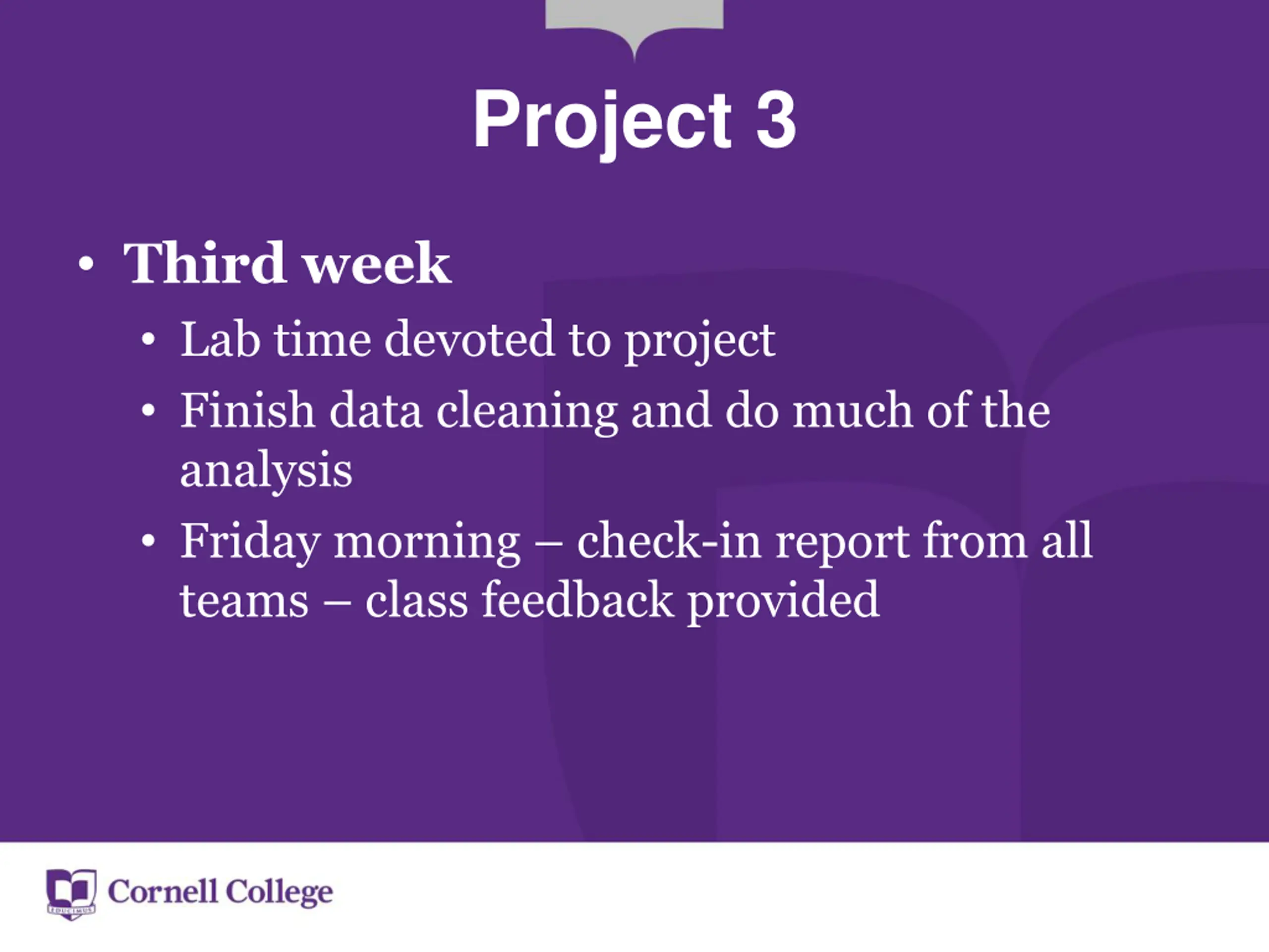 Project 3 Third week Lab time devoted to project Finish data cleaning and do much of the analysis Friday morning check-in report from all teams class feedback provided