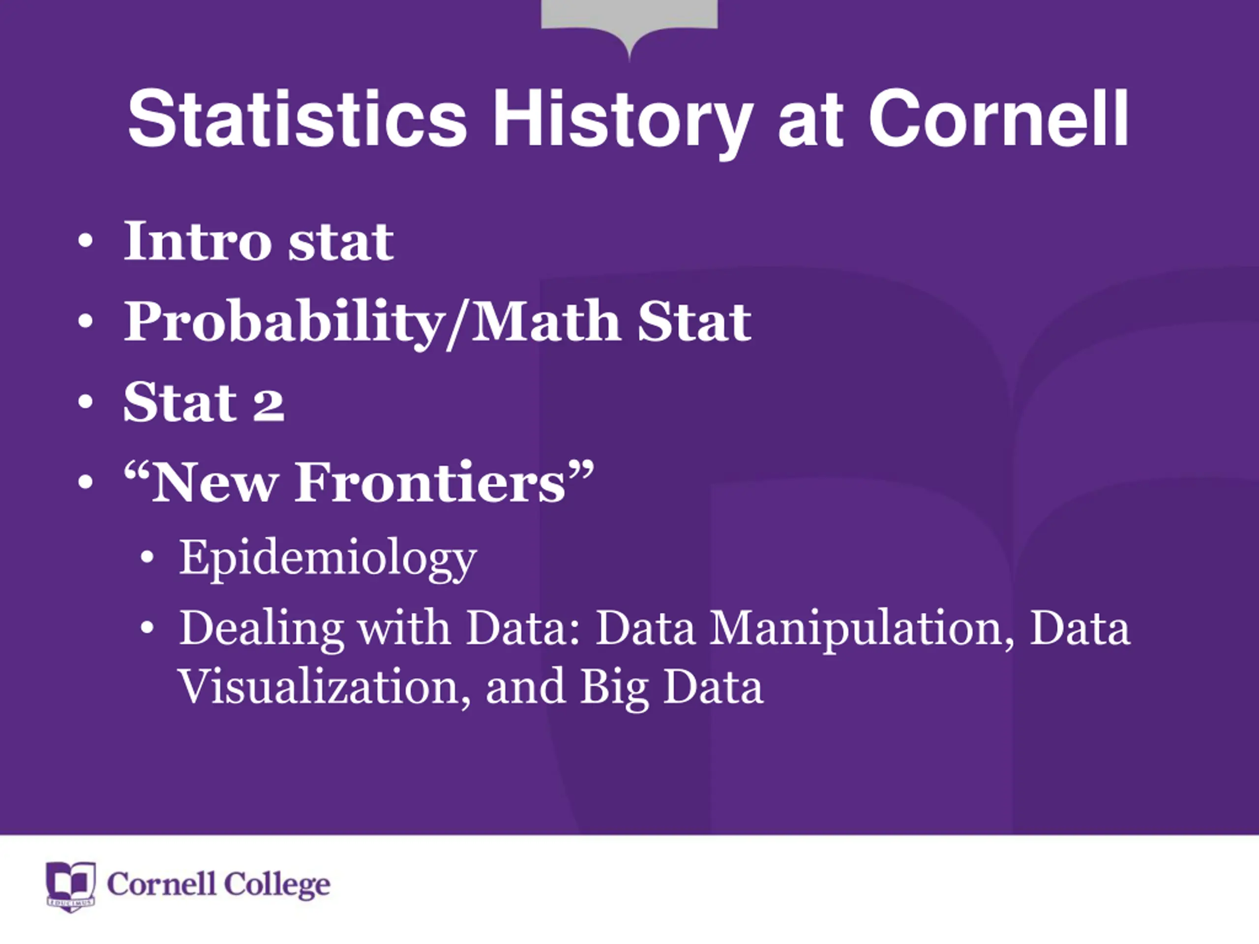 Statistics History at Cornell Intro stat Probability/Math Stat Stat 2 New Frontiers Epidemiology Dealing with Data: Data Manipulation, Data Visualization, and Big Data