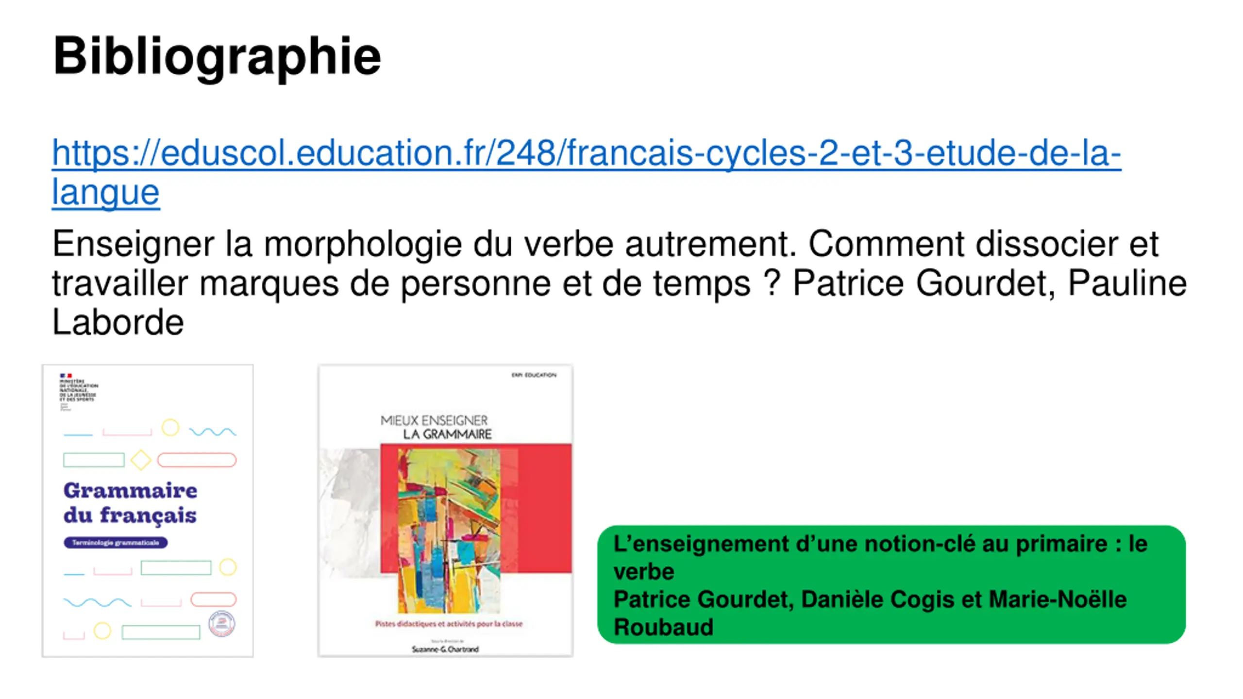 Bibliographie https://eduscol.education.fr/248/francais-cycles-2-et-3-etude-de-la- langue Enseigner la morphologie du verbe autrement. Comment dissocier et travailler marques de personne et de temps ? Patrice Gourdet, Pauline Laborde L enseignement d une notion-cl au primaire : le verbe Patrice Gourdet, Dani le Cogis et Marie-No lle Roubaud