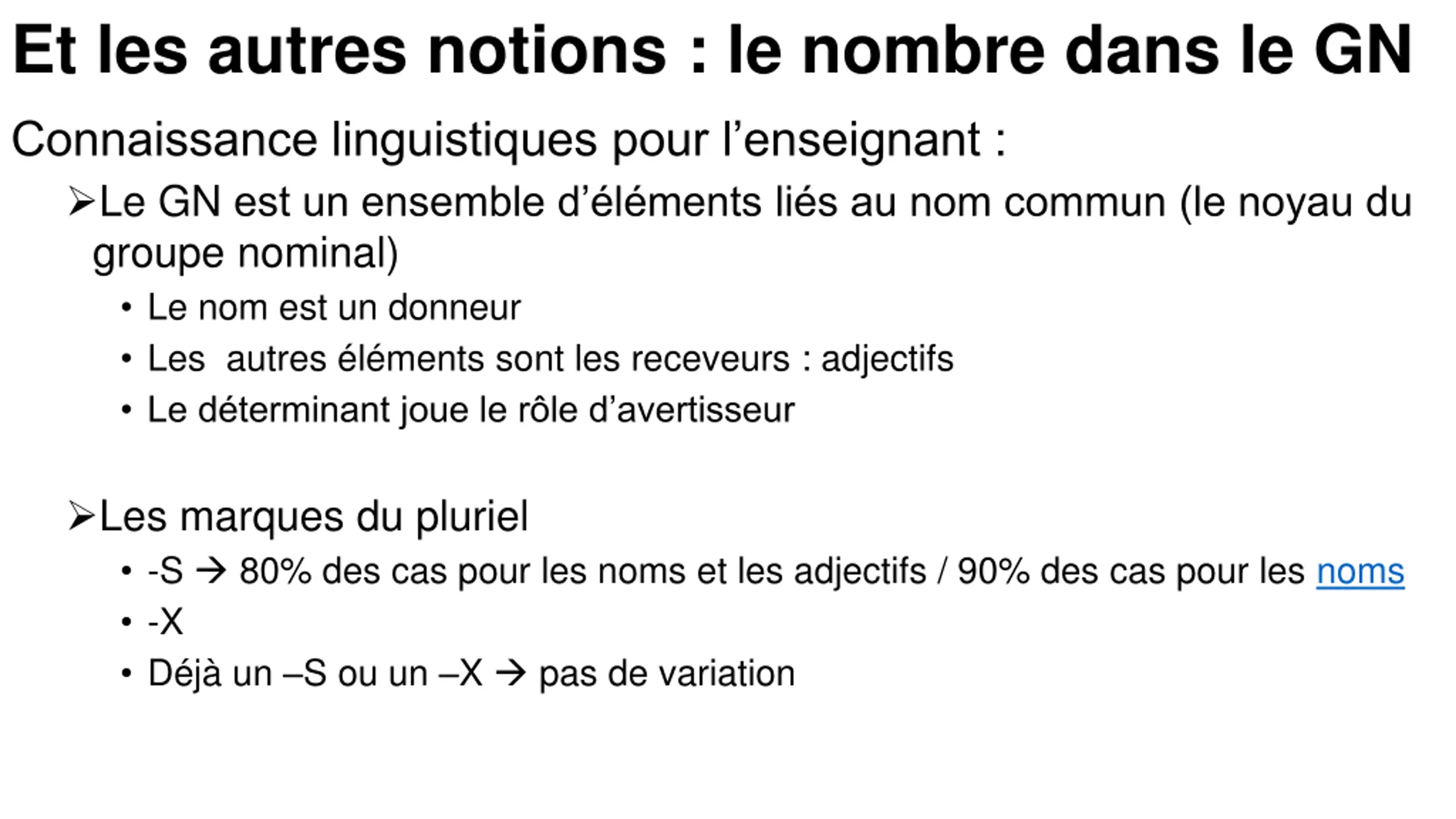 Et les autres notions : le nombre dans le GN Connaissance linguistiques pour l enseignant : Le GN est un ensemble d l ments li s au nom commun (le noyau du groupe nominal) Le nom est un donneur Les autres l ments sont les receveurs : adjectifs Le d terminant joue le r le d avertisseur Les marques du pluriel -S 80% des cas pour les noms et les adjectifs / 90% des cas pour les noms -X D j un S ou un X pas de variation