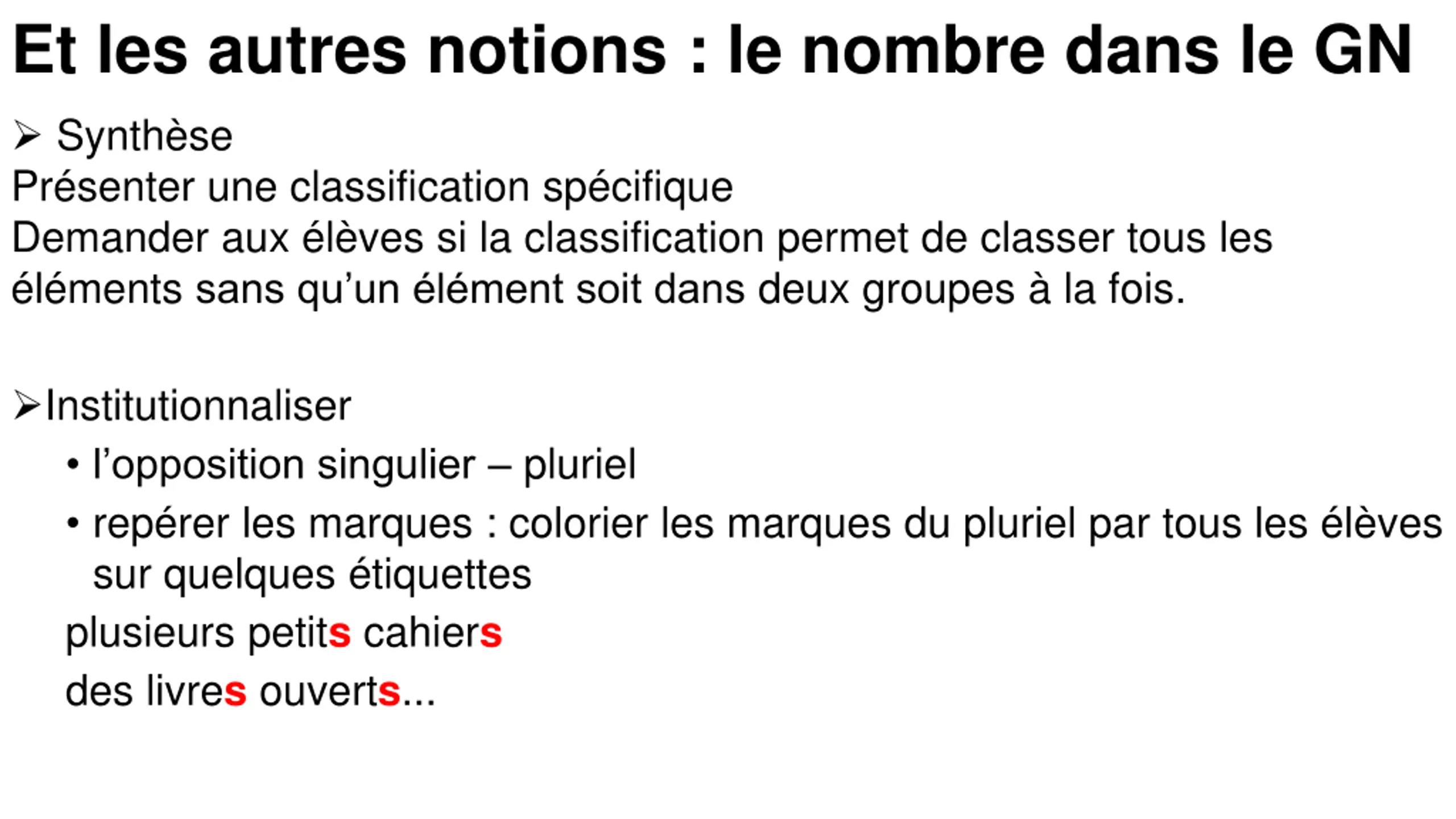 Et les autres notions : le nombre dans le GN Synth se Pr senter une classification sp cifique Demander aux l ves si la classification permet de classer tous les l ments sans qu un l ment soit dans deux groupes la fois. Institutionnaliser l opposition singulier pluriel rep rer les marques : colorier les marques du pluriel par tous les l ves sur quelques tiquettes plusieurs petits cahiers des livres ouverts...