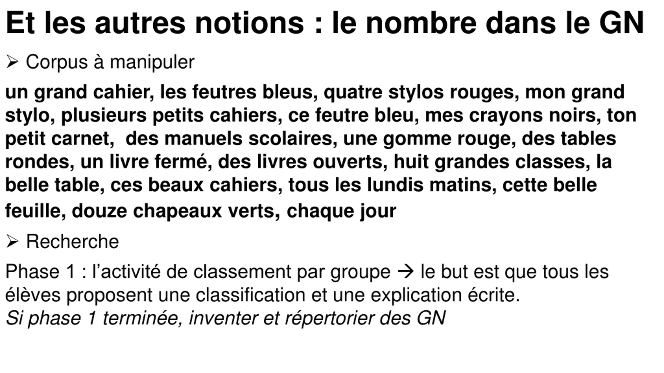 Et les autres notions : le nombre dans le GN Corpus manipuler un grand cahier, les feutres bleus, quatre stylos rouges, mon grand stylo, plusieurs petits cahiers, ce feutre bleu, mes crayons noirs, ton petit carnet, des manuels scolaires, une gomme rouge, des tables rondes, un livre ferm , des livres ouverts, huit grandes classes, la belle table, ces beaux cahiers, tous les lundis matins, cette belle feuille, douze chapeaux verts, chaque jour Recherche Phase 1 : l activit de classement par groupe le but est que tous les l ves proposent une classification et une explication crite. Si phase 1 termin e, inventer et r pertorier des GN