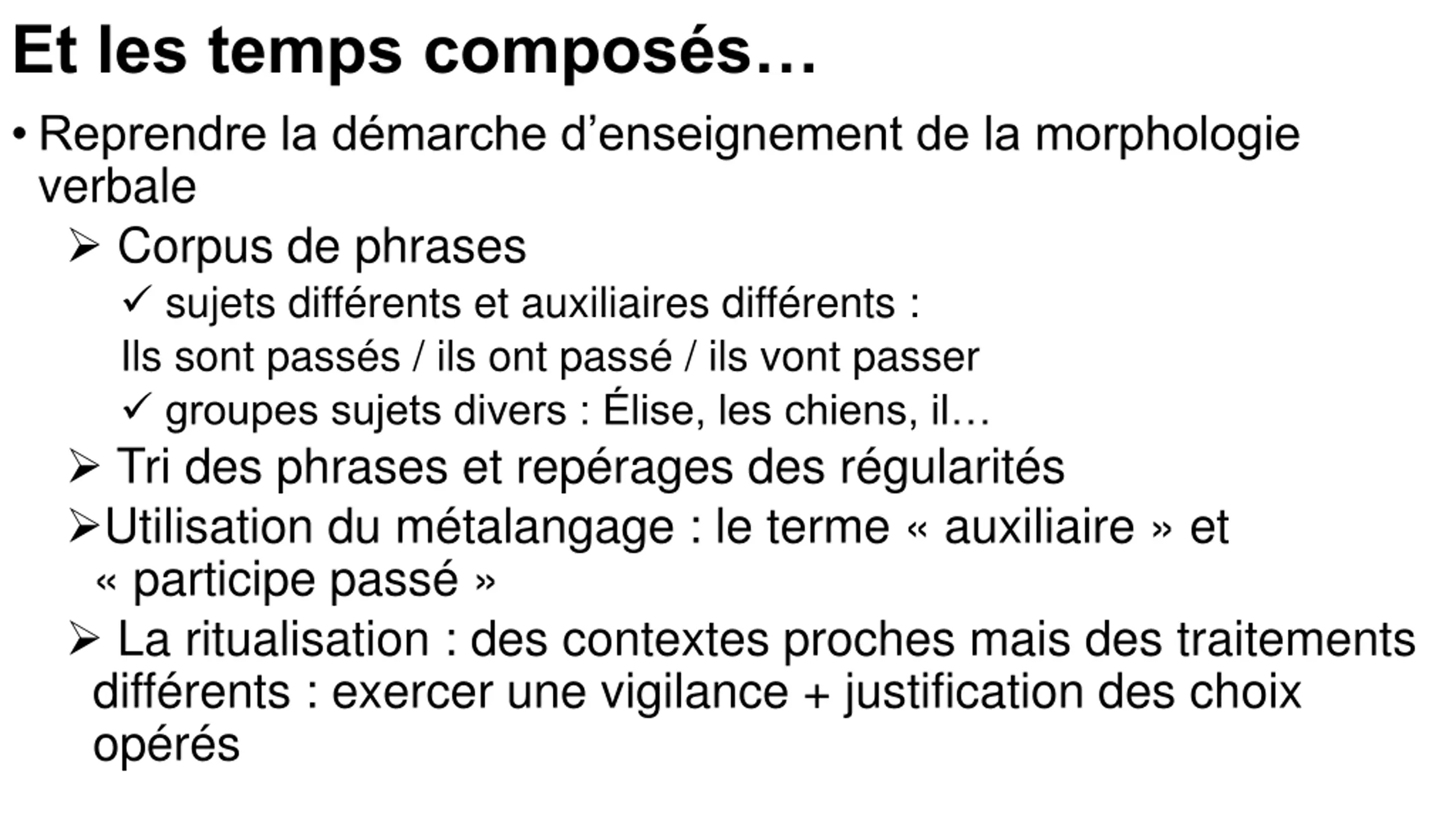 Et les temps composs Reprendre la d marche d enseignement de la morphologie verbale Corpus de phrases sujets diff rents et auxiliaires diff rents : Ils sont pass s / ils ont pass / ils vont passer groupes sujets divers : lise, les chiens, il Tri des phrases et rep rages des r gularit s Utilisation du m talangage : le terme auxiliaire et participe pass La ritualisation : des contextes proches mais des traitements diff rents : exercer une vigilance + justification des choix op r s