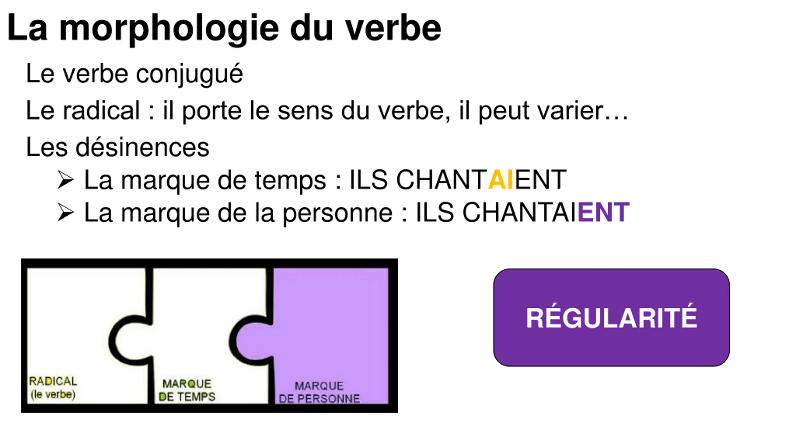 La morphologie du verbe Le verbe conjugu Le radical : il porte le sens du verbe, il peut varier Les d sinences La marque de temps : ILS CHANTAIENT La marque de la personne : ILS CHANTAIENT R GULARIT