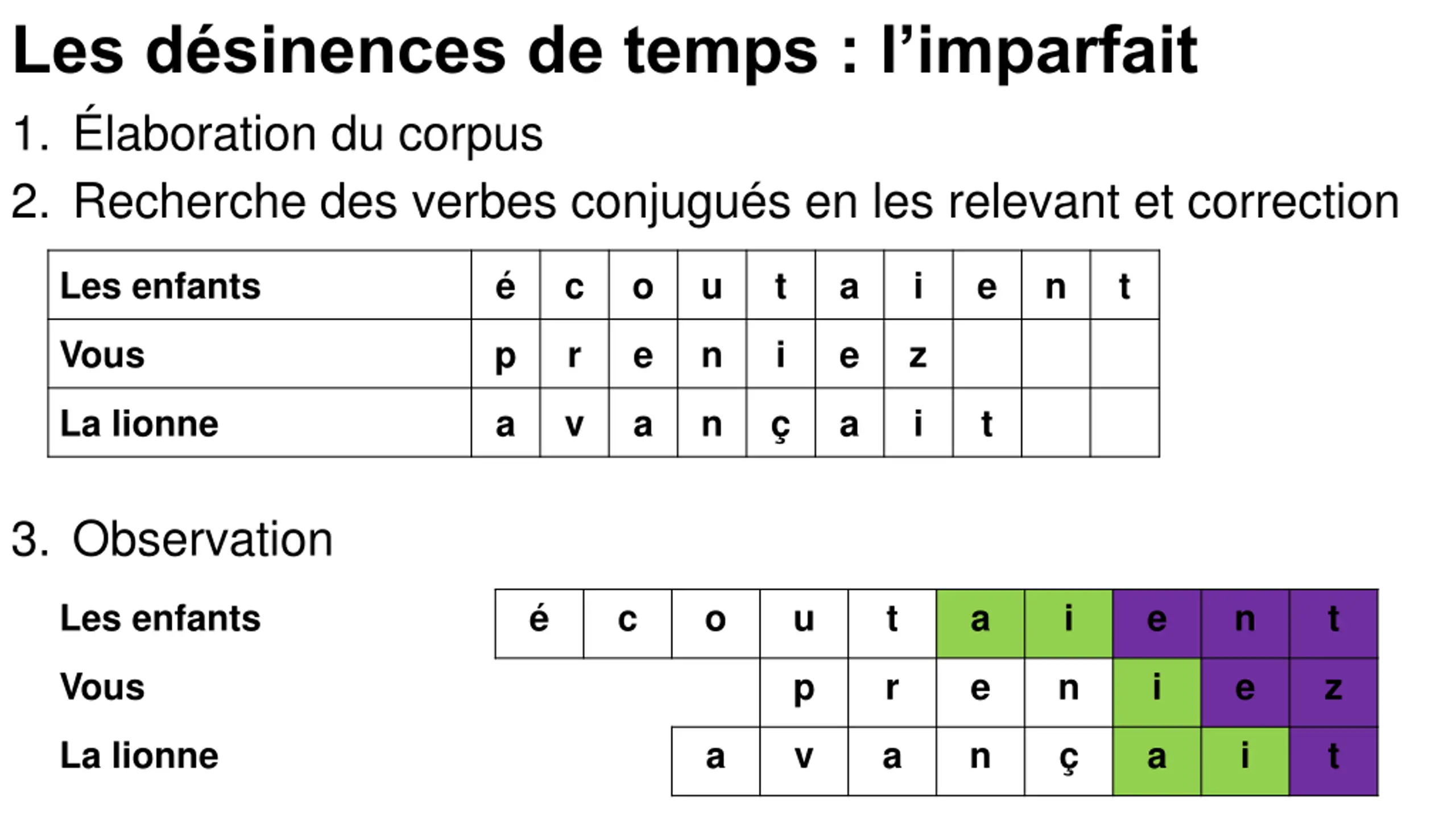 Les dsinences de temps : limparfait 1. laboration du corpus 2. Recherche des verbes conjugu s en les relevant et correction Les enfants c o u t a i e n t Vous p r e n i e z La lionne a v a n a i t 3. Observation Les enfants c o u t a i e n t Vous p r e n i e z La lionne a v a n a i t