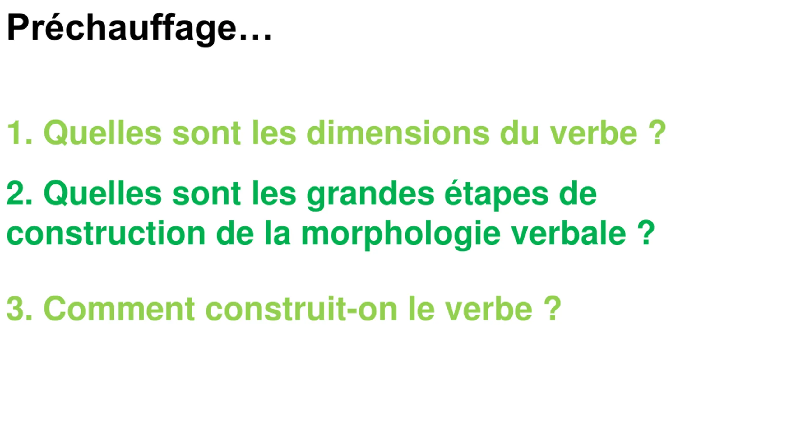 Prchauffage 1. Quelles sont les dimensions du verbe ? 2. Quelles sont les grandes tapes de construction de la morphologie verbale ? 3. Comment construit-on le verbe ?