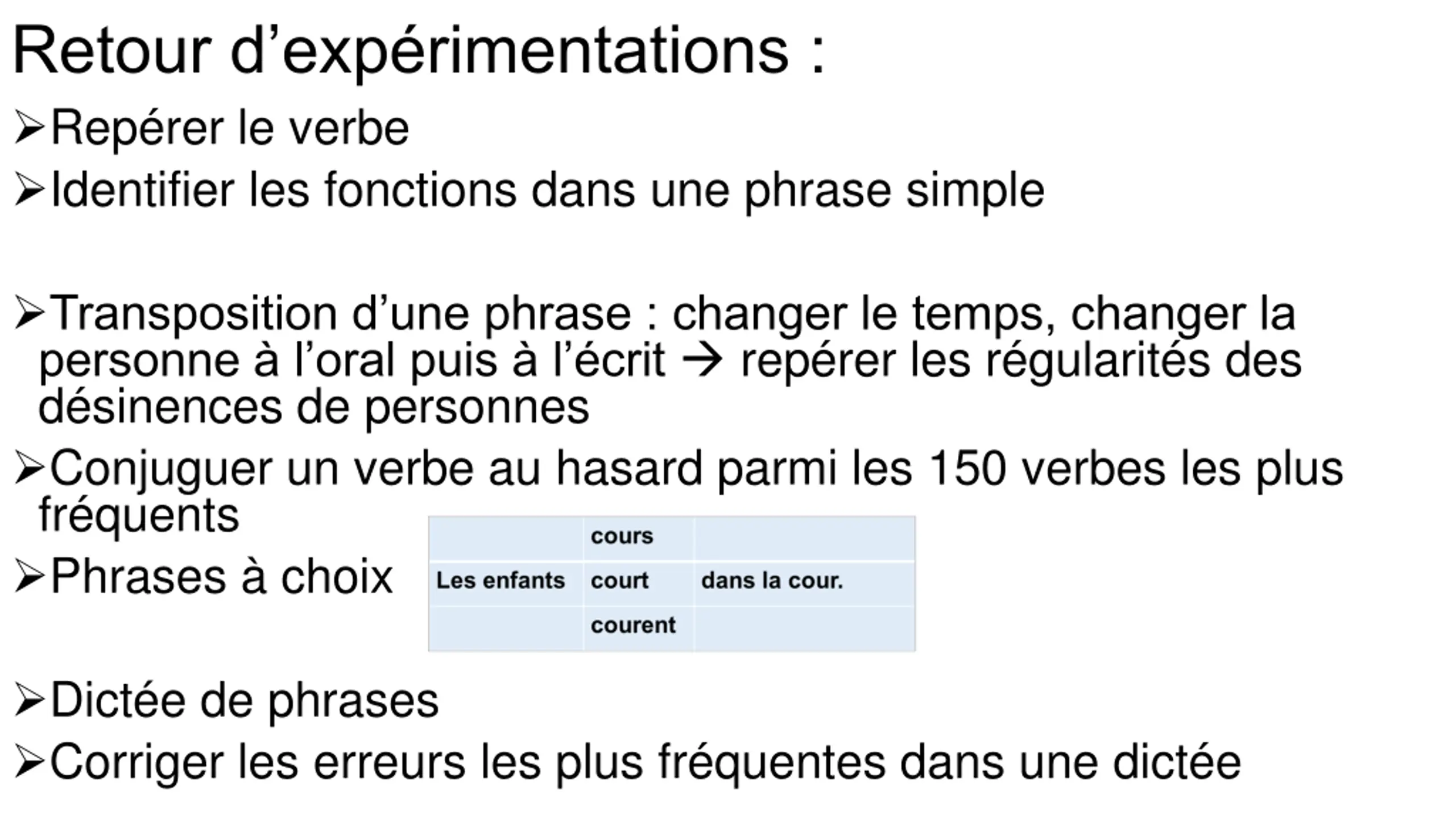 Retour dexprimentations : Rep rer le verbe Identifier les fonctions dans une phrase simple Transposition d une phrase : changer le temps, changer la personne l oral puis l crit rep rer les r gularit s des d sinences de personnes Conjuguer un verbe au hasard parmi les 150 verbes les plus fr quents Phrases choix Dict e de phrases Corriger les erreurs les plus fr quentes dans une dict e