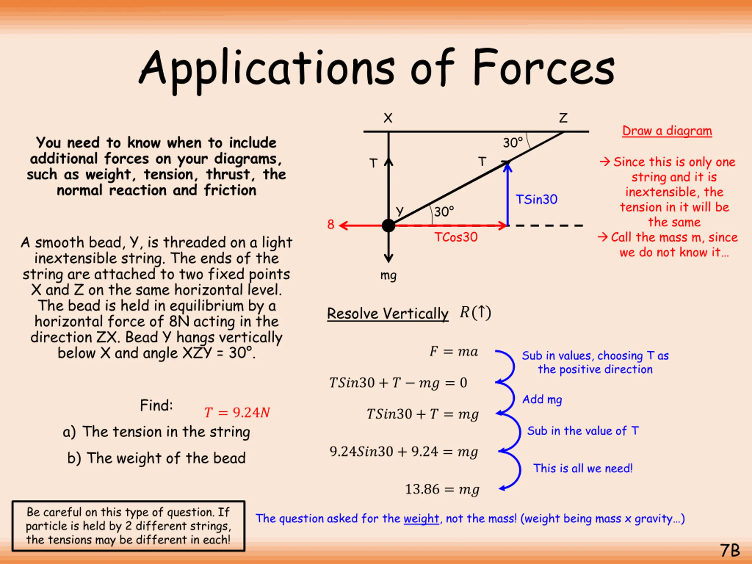 Applications of Forces X Z Draw a diagram You need to know when to include additional forces on your diagrams, such as weight, tension, thrust, the normal reaction and friction 30 T Since this is only one string and it is inextensible, the tension in it will be the same Call the mass m, since we do not know it T TSin30 Y 30 8 TCos30 A smooth bead, Y, is threaded on a light inextensible string. The ends of the string are attached to two fixed points X and Z on the same horizontal level. The bead is held in equilibrium by a horizontal force of 8N acting in the direction ZX. Bead Y hangs vertically below X and angle XZY = 30 . mg Resolve Horizontally ?( ) ? = ?? Sub in values, choosing T as the positive direction ????30 8 = 0 Add 8 Find: ? = 9.24? ????30 = 8 a) The tension in the string b) The weight of the bead Divide by Cos30 8 ? = ???30 Calculate ? = 9.24? 7B