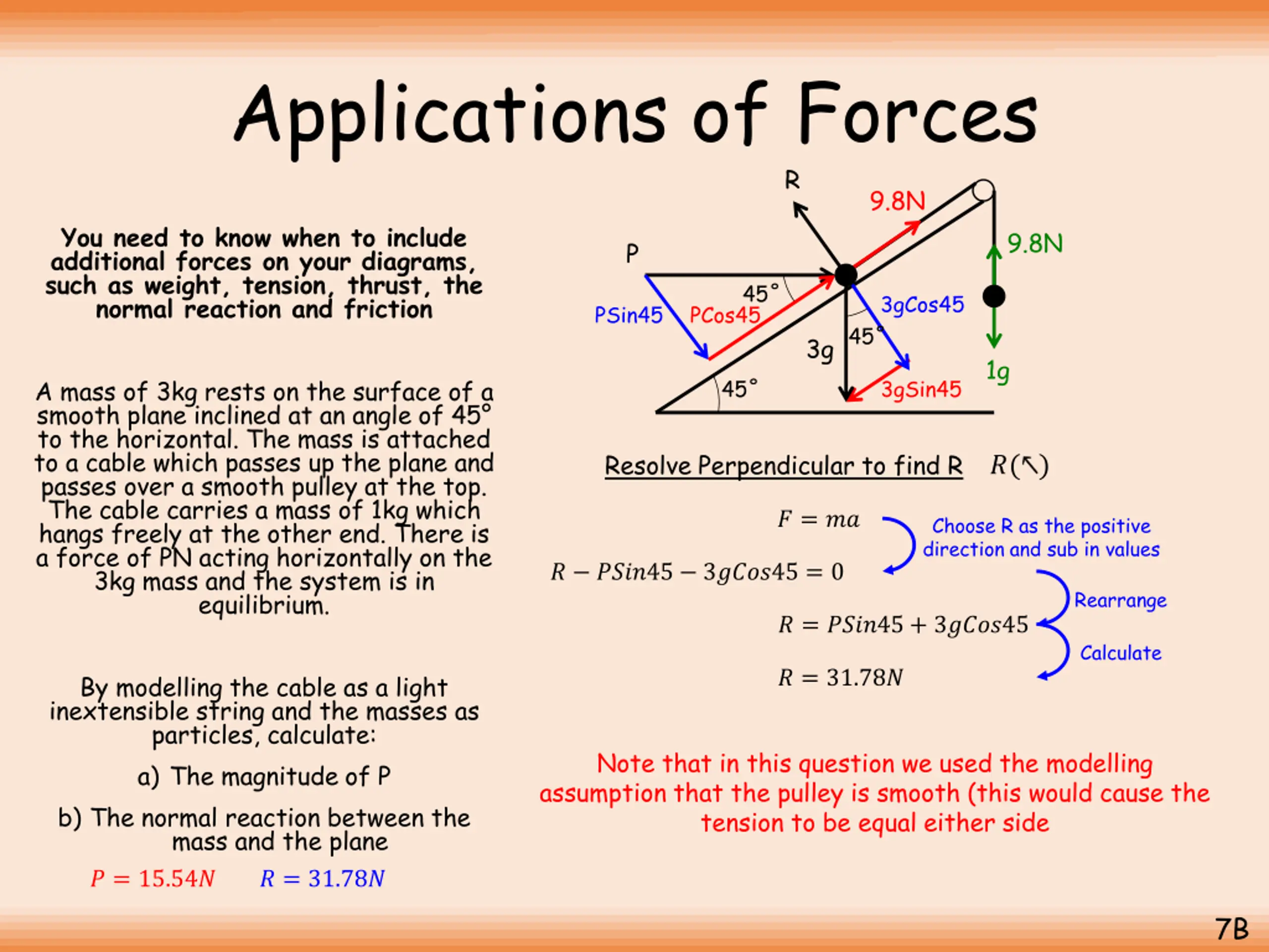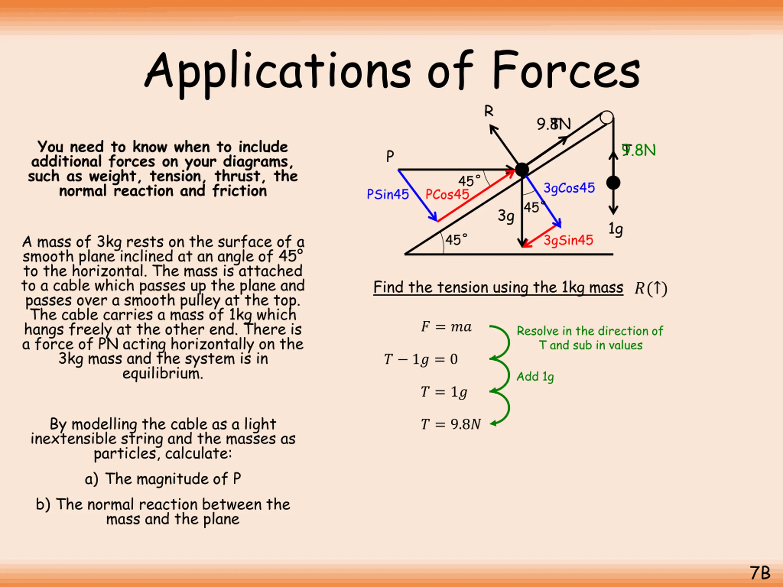 Applications of Forces R 9.8N T You need to know when to include additional forces on your diagrams, such as weight, tension, thrust, the normal reaction and friction T 9.8N P 45 3gCos45 PSin45 PCos45 45 3g 1g A mass of 3kg rests on the surface of a smooth plane inclined at an angle of 45 to the horizontal. The mass is attached to a cable which passes up the plane and passes over a smooth pulley at the top. The cable carries a mass of 1kg which hangs freely at the other end. There is a force of PN acting horizontally on the 3kg mass and the system is in equilibrium. 45 3gSin45 Find the tension using the 1kg mass ?( ) ? = ?? Resolve in the direction of T and sub in values ? 1? = 0 Add 1g ? = 1? By modelling the cable as a light inextensible string and the masses as particles, calculate: a) The magnitude of P b) The normal reaction between the mass and the plane ? = 9.8? 7B