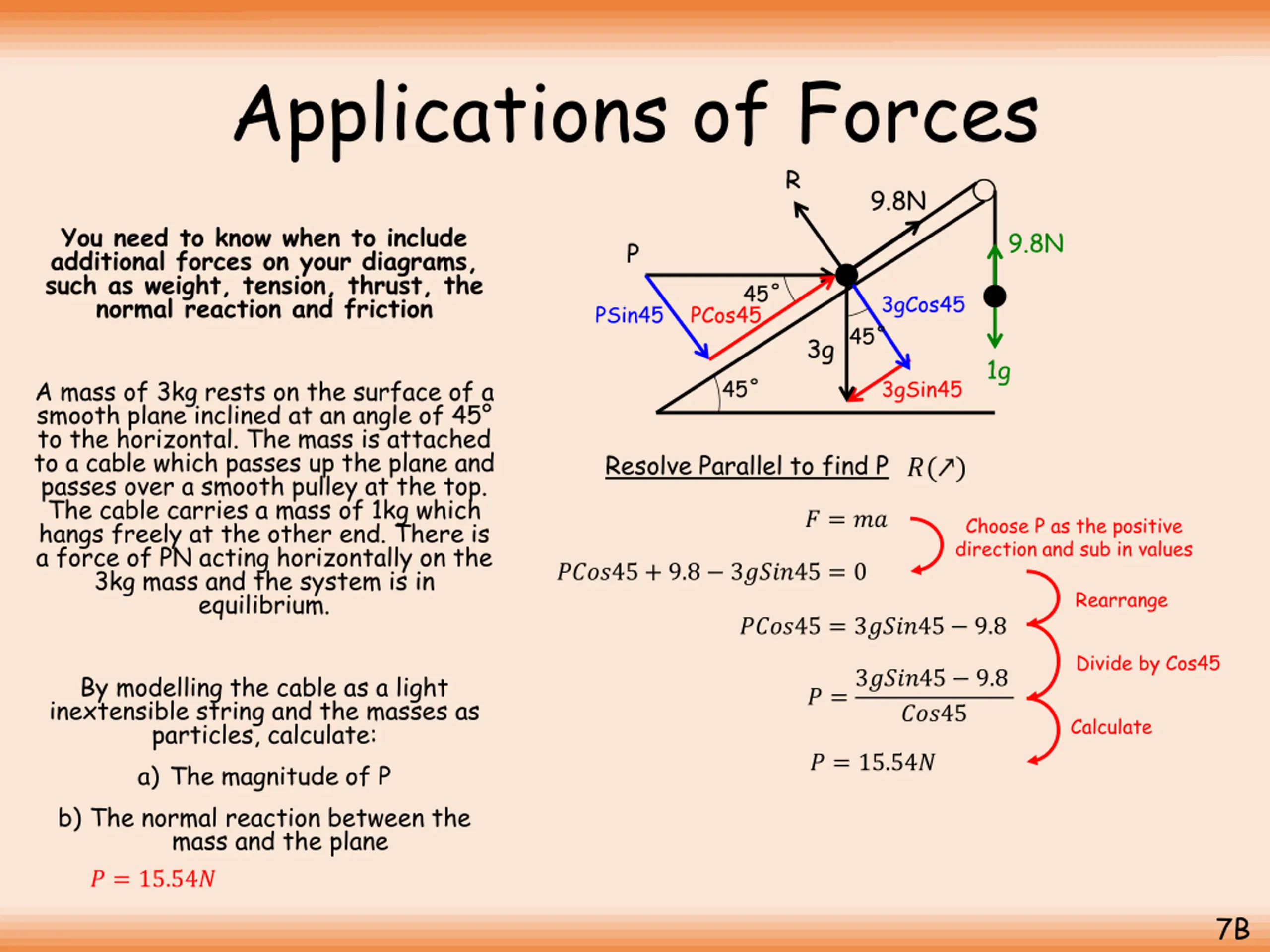 Applications of Forces R 9.8N You need to know when to include additional forces on your diagrams, such as weight, tension, thrust, the normal reaction and friction 9.8N P 45 3gCos45 PSin45 PCos45 45 3g 1g A mass of 3kg rests on the surface of a smooth plane inclined at an angle of 45 to the horizontal. The mass is attached to a cable which passes up the plane and passes over a smooth pulley at the top. The cable carries a mass of 1kg which hangs freely at the other end. There is a force of PN acting horizontally on the 3kg mass and the system is in equilibrium. 45 3gSin45 Resolve Parallel to find P ?( ) ? = ?? Choose P as the positive direction and sub in values ????45 + 9.8 3????45 = 0 Rearrange ????45 = 3????45 9.8 Divide by Cos45 ? =3????45 9.8 ???45 By modelling the cable as a light inextensible string and the masses as particles, calculate: a) The magnitude of P b) The normal reaction between the mass and the plane ? = 15.54? Calculate ? = 15.54? 7B