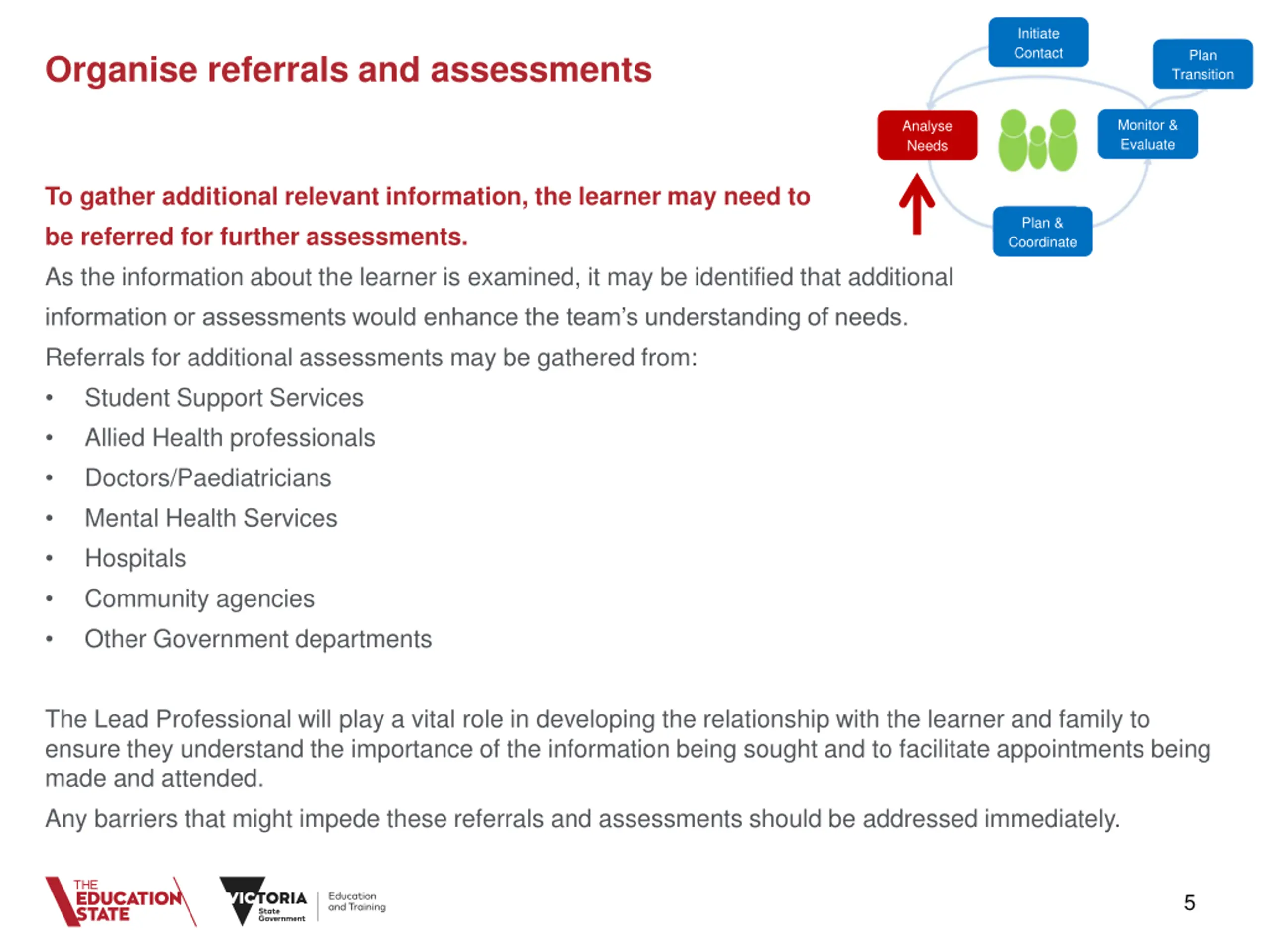 Initiate Contact Plan Transition Organise referrals and assessments Monitor & Evaluate Analyse Needs To gather additional relevant information, the learner may need to be referred for further assessments. As the information about the learner is examined, it may be identified that additional information or assessments would enhance the team s understanding of needs. Referrals for additional assessments may be gathered from: Student Support Services Allied Health professionals Doctors/Paediatricians Mental Health Services Hospitals Community agencies Other Government departments Plan & Coordinate The Lead Professional will play a vital role in developing the relationship with the learner and family to ensure they understand the importance of the information being sought and to facilitate appointments being made and attended. Any barriers that might impede these referrals and assessments should be addressed immediately. 5