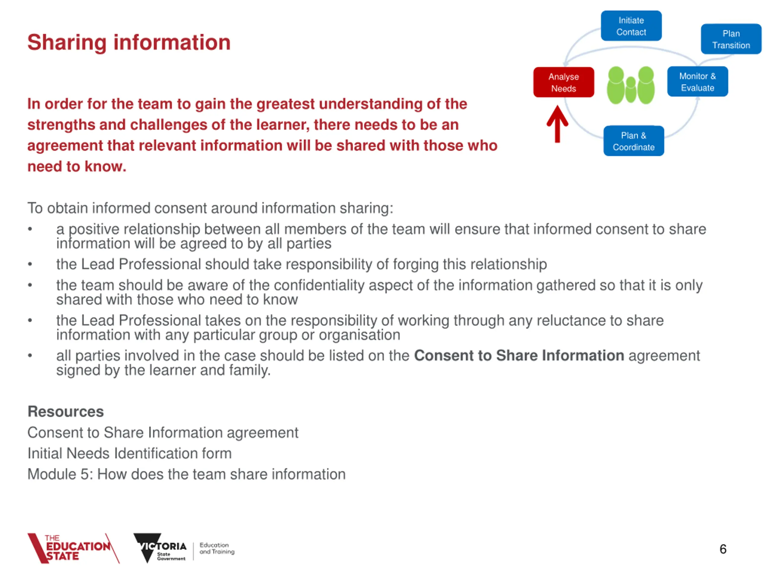 Initiate Contact Plan Transition Sharing information Monitor & Evaluate Analyse Needs In order for the team to gain the greatest understanding of the strengths and challenges of the learner, there needs to be an agreement that relevant information will be shared with those who need to know. Plan & Coordinate To obtain informed consent around information sharing: a positive relationship between all members of the team will ensure that informed consent to share information will be agreed to by all parties the Lead Professional should take responsibility of forging this relationship the team should be aware of the confidentiality aspect of the information gathered so that it is only shared with those who need to know the Lead Professional takes on the responsibility of working through any reluctance to share information with any particular group or organisation all parties involved in the case should be listed on the Consent to Share Information agreement signed by the learner and family. Resources Consent to Share Information agreement Initial Needs Identification form Module 5: How does the team share information 6