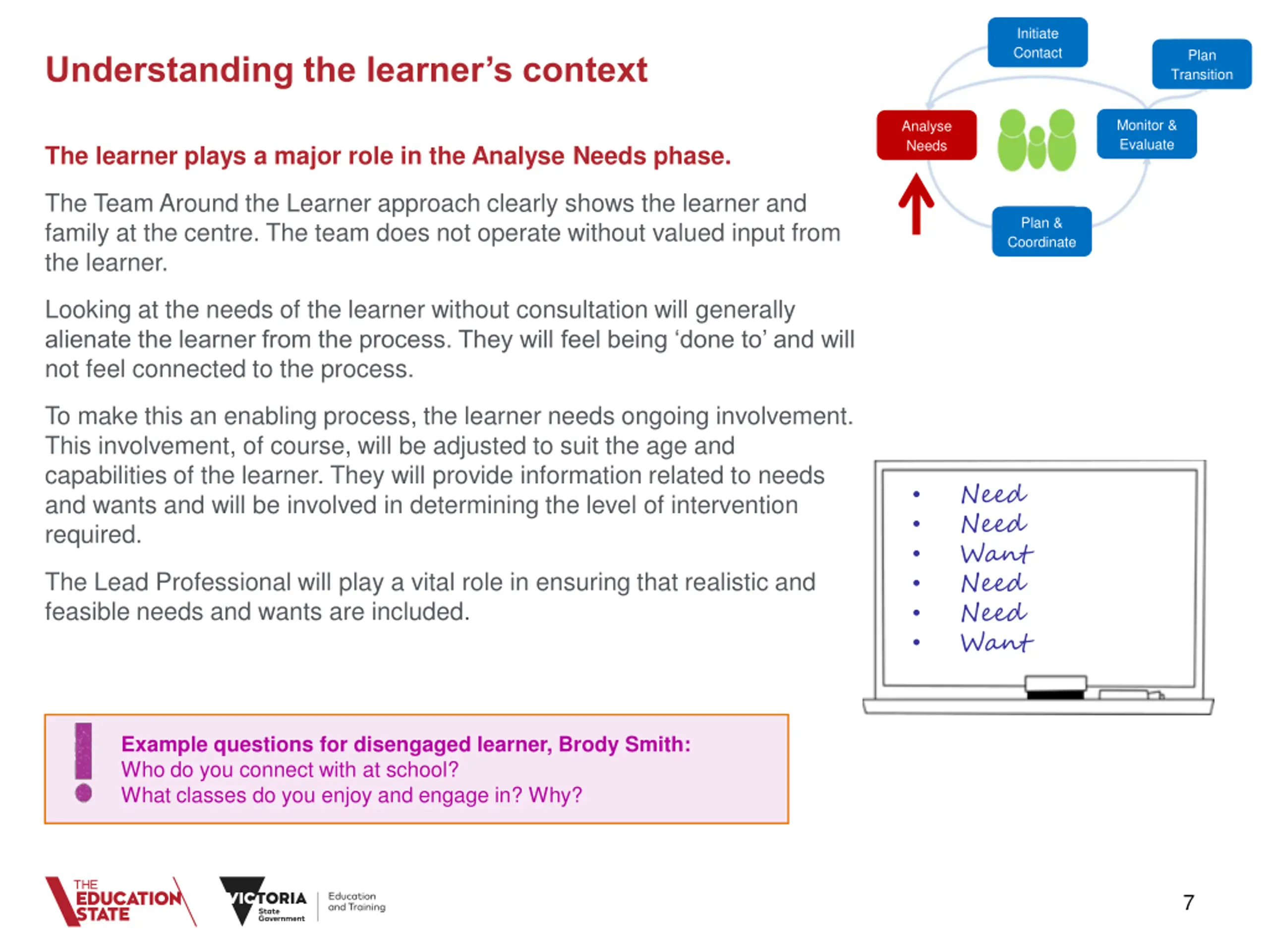 Initiate Contact Plan Transition Understanding the learner s context Monitor & Evaluate Analyse Needs The learner plays a major role in the Analyse Needs phase. The Team Around the Learner approach clearly shows the learner and family at the centre. The team does not operate without valued input from the learner. Plan & Coordinate Looking at the needs of the learner without consultation will generally alienate the learner from the process. They will feel being done to and will not feel connected to the process. To make this an enabling process, the learner needs ongoing involvement. This involvement, of course, will be adjusted to suit the age and capabilities of the learner. They will provide information related to needs and wants and will be involved in determining the level of intervention required. Need Need Want Need Need Want The Lead Professional will play a vital role in ensuring that realistic and feasible needs and wants are included. Example questions for disengaged learner, Brody Smith: Who do you connect with at school? What classes do you enjoy and engage in? Why? 7