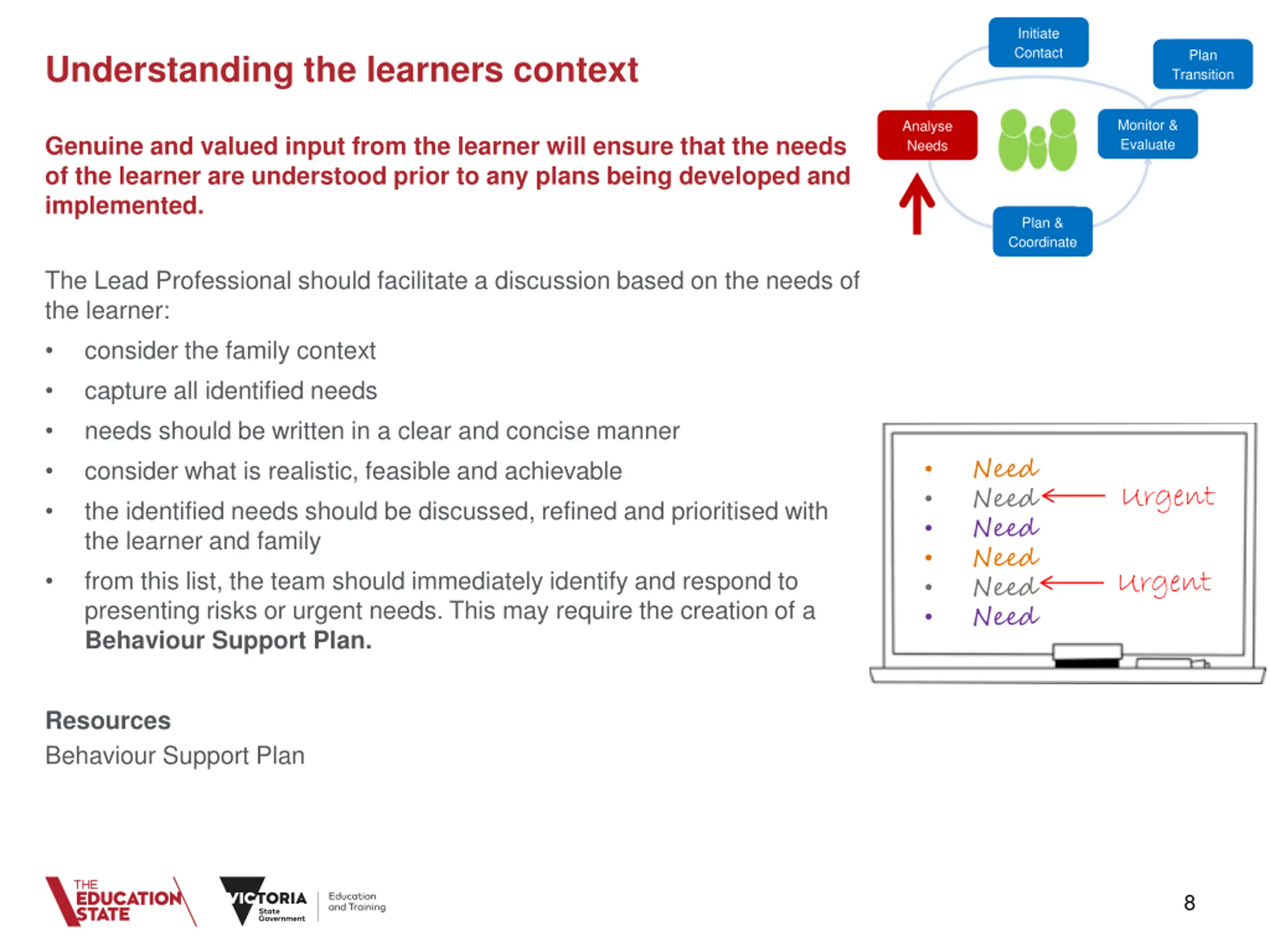 Initiate Contact Plan Transition Understanding the learners context Monitor & Evaluate Analyse Needs Genuine and valued input from the learner will ensure that the needs of the learner are understood prior to any plans being developed and implemented. Plan & Coordinate The Lead Professional should facilitate a discussion based on the needs of the learner: consider the family context capture all identified needs needs should be written in a clear and concise manner consider what is realistic, feasible and achievable the identified needs should be discussed, refined and prioritised with the learner and family from this list, the team should immediately identify and respond to presenting risks or urgent needs. This may require the creation of a Behaviour Support Plan. Need Need Need Need Need Need Urgent Urgent Resources Behaviour Support Plan 8