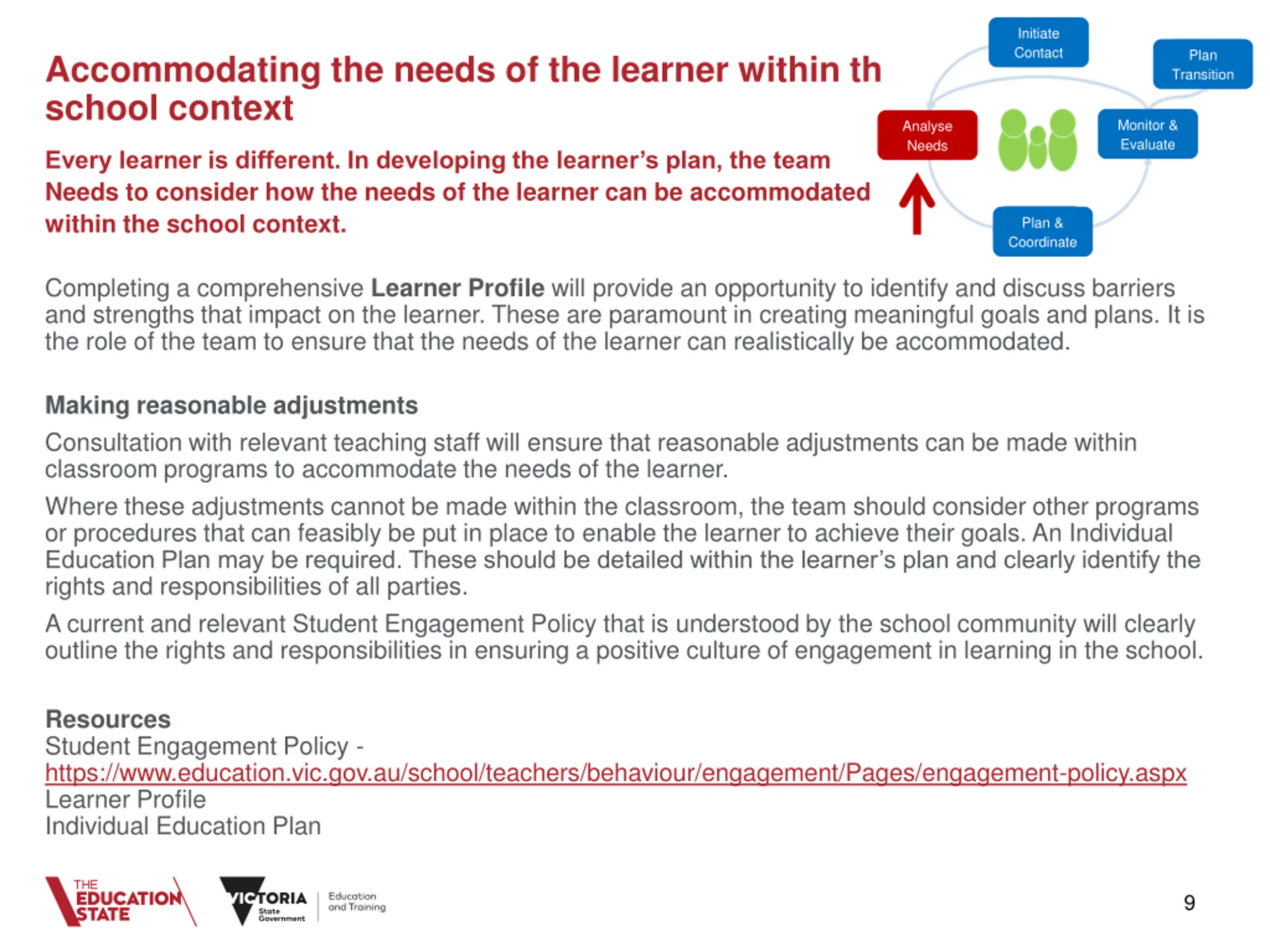 Initiate Contact Plan Transition Accommodating the needs of the learner within the school context Monitor & Evaluate Analyse Needs Every learner is different. In developing the learner s plan, the team Needs to consider how the needs of the learner can be accommodated within the school context. Plan & Coordinate Completing a comprehensive Learner Profile will provide an opportunity to identify and discuss barriers and strengths that impact on the learner. These are paramount in creating meaningful goals and plans. It is the role of the team to ensure that the needs of the learner can realistically be accommodated. Making reasonable adjustments Consultation with relevant teaching staff will ensure that reasonable adjustments can be made within classroom programs to accommodate the needs of the learner. Where these adjustments cannot be made within the classroom, the team should consider other programs or procedures that can feasibly be put in place to enable the learner to achieve their goals. An Individual Education Plan may be required. These should be detailed within the learner s plan and clearly identify the rights and responsibilities of all parties. A current and relevant Student Engagement Policy that is understood by the school community will clearly outline the rights and responsibilities in ensuring a positive culture of engagement in learning in the school. Resources Student Engagement Policy - https://www.education.vic.gov.au/school/teachers/behaviour/engagement/Pages/engagement-policy.aspx Learner Profile Individual Education Plan 9