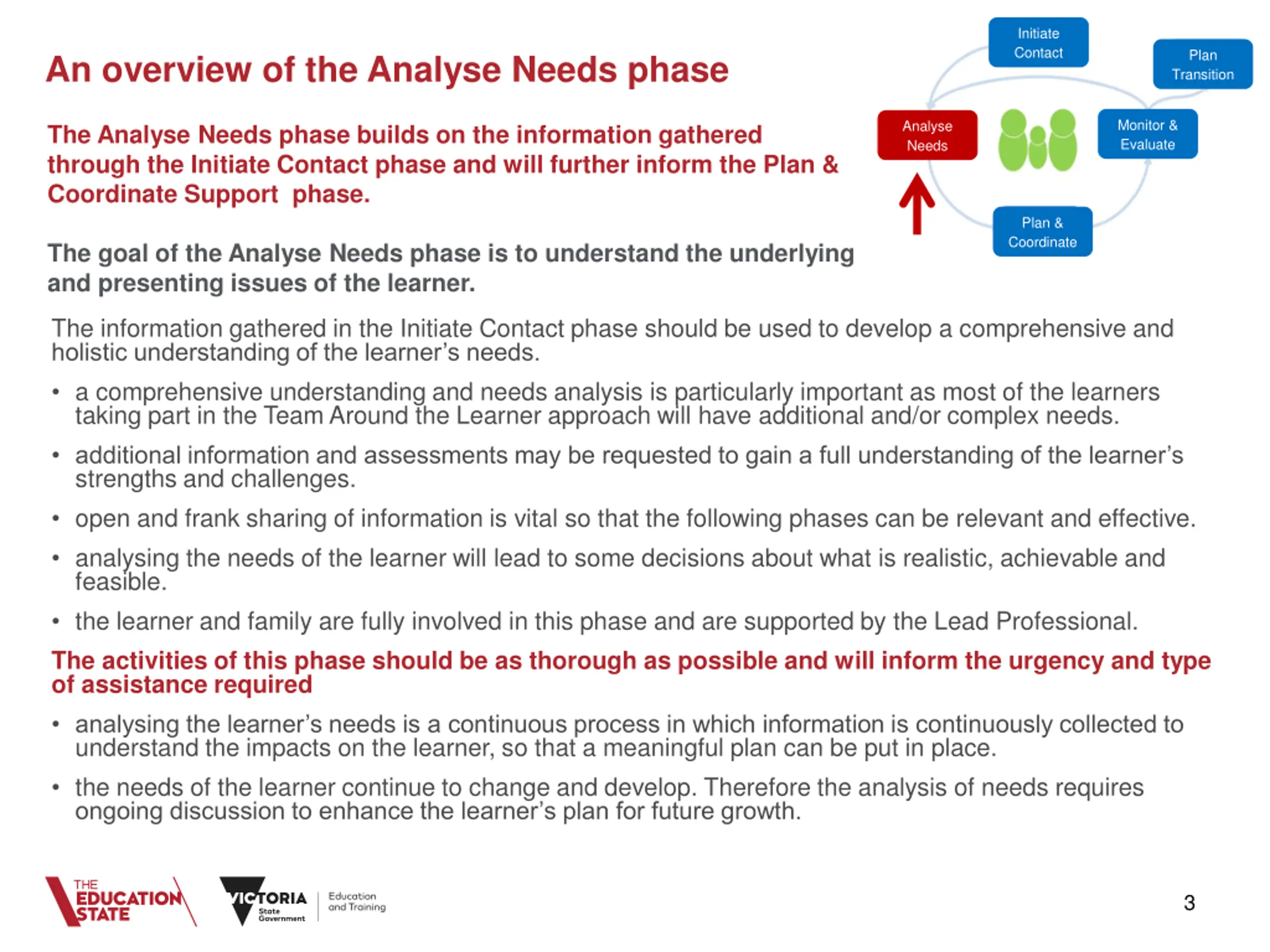 Initiate Contact Plan Transition An overview of the Analyse Needs phase Monitor & Evaluate Analyse Needs The Analyse Needs phase builds on the information gathered through the Initiate Contact phase and will further inform the Plan & Coordinate Support phase. Plan & Coordinate The goal of the Analyse Needs phase is to understand the underlying and presenting issues of the learner. The information gathered in the Initiate Contact phase should be used to develop a comprehensive and holistic understanding of the learner s needs. a comprehensive understanding and needs analysis is particularly important as most of the learners taking part in the Team Around the Learner approach will have additional and/or complex needs. additional information and assessments may be requested to gain a full understanding of the learner s strengths and challenges. open and frank sharing of information is vital so that the following phases can be relevant and effective. analysing the needs of the learner will lead to some decisions about what is realistic, achievable and feasible. the learner and family are fully involved in this phase and are supported by the Lead Professional. The activities of this phase should be as thorough as possible and will inform the urgency and type of assistance required analysing the learner s needs is a continuous process in which information is continuously collected to understand the impacts on the learner, so that a meaningful plan can be put in place. the needs of the learner continue to change and develop. Therefore the analysis of needs requires ongoing discussion to enhance the learner s plan for future growth. 3