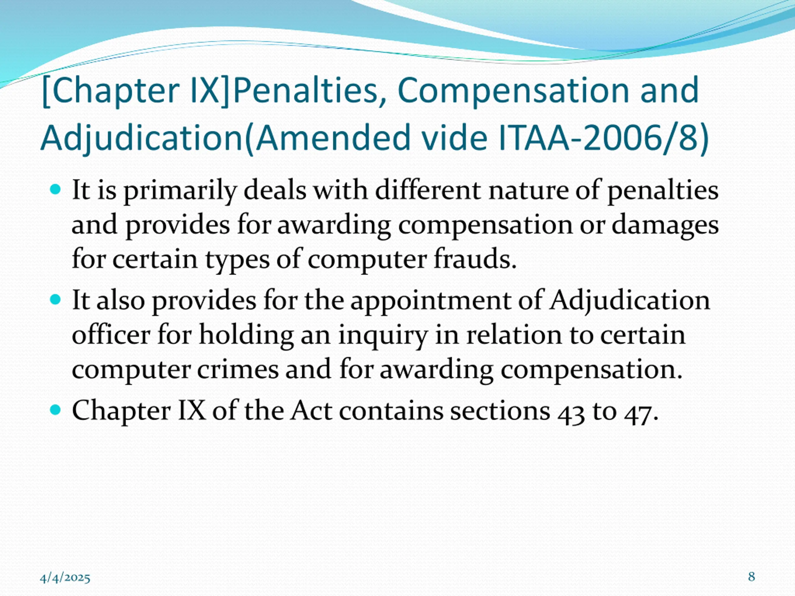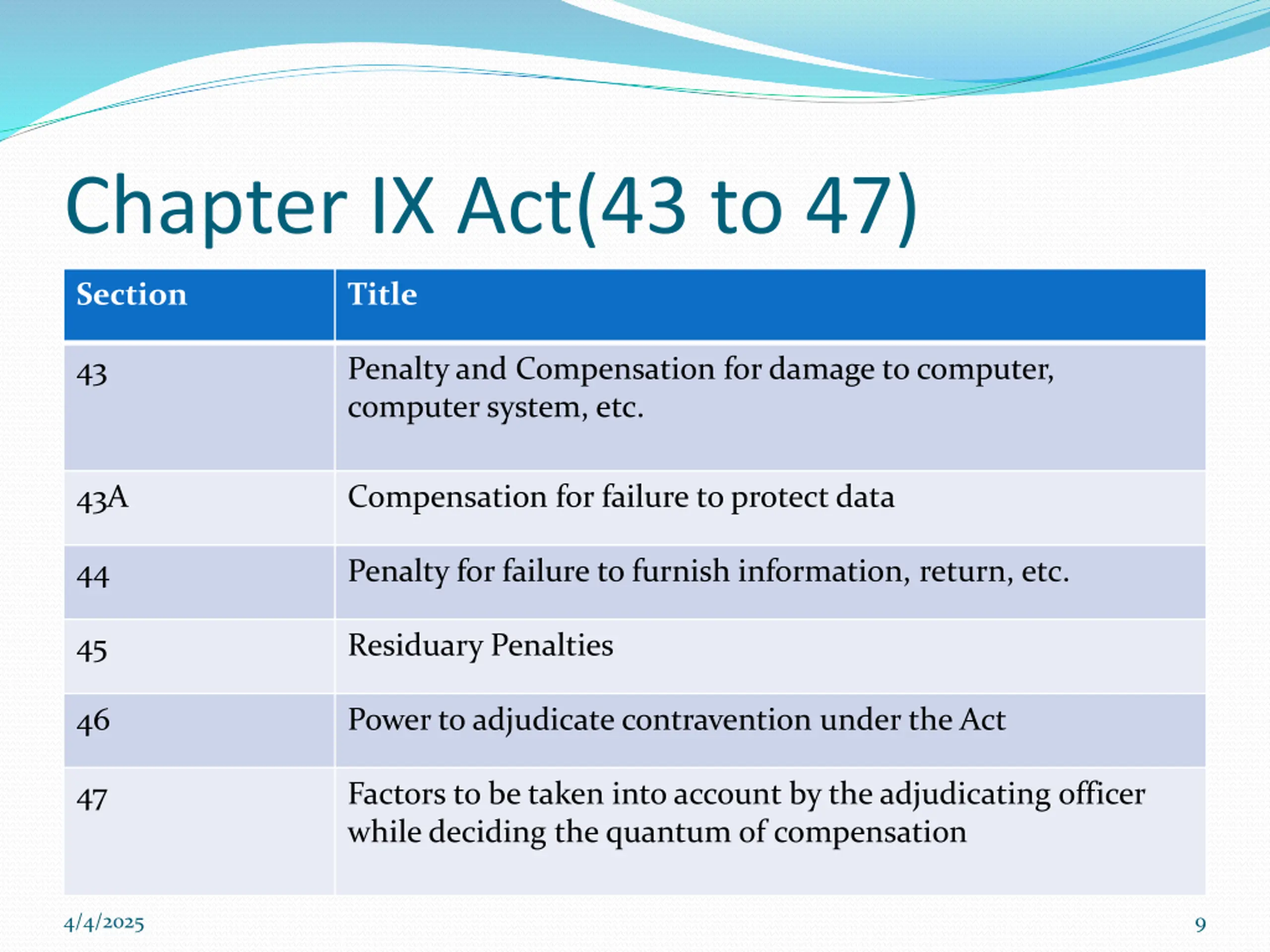 [Chapter IX]Penalties, Compensation and Adjudication(Amended vide ITAA-2006/8) It is primarily deals with different nature of penalties and provides for awarding compensation or damages for certain types of computer frauds. It also provides for the appointment of Adjudication officer for holding an inquiry in relation to certain computer crimes and for awarding compensation. Chapter IX of the Act contains sections 43 to 47. 4/4/2025 8
