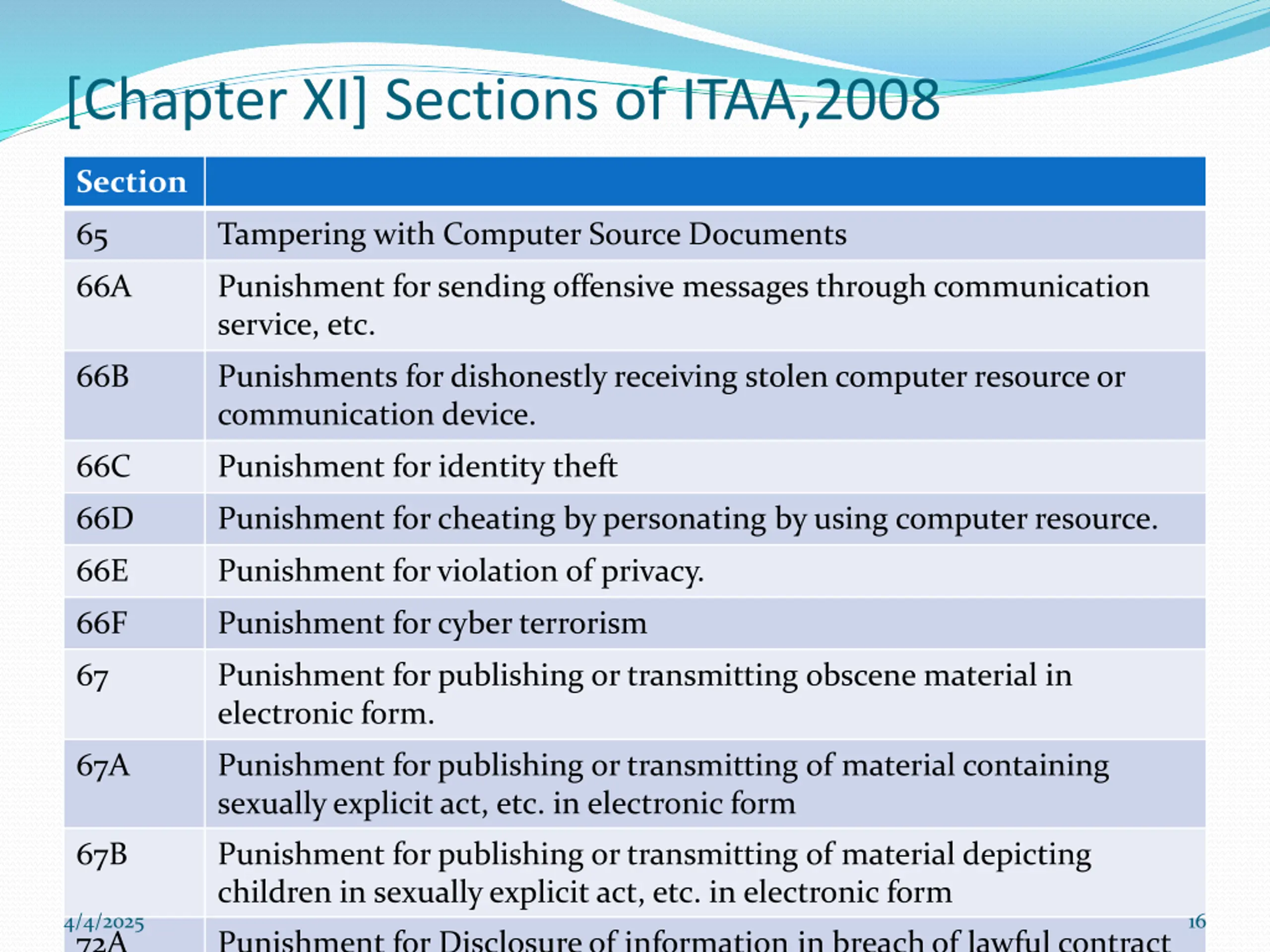 [Chapter XI] Offences The IT Act covers two important area related to the cyber world: a) Legal recognition to electronic records b) Computer related offences. Chapter XI of the Act contains sections 65 to 78 which deal with various computer crimes and provide for penalties for these offences. 4/4/2025 15