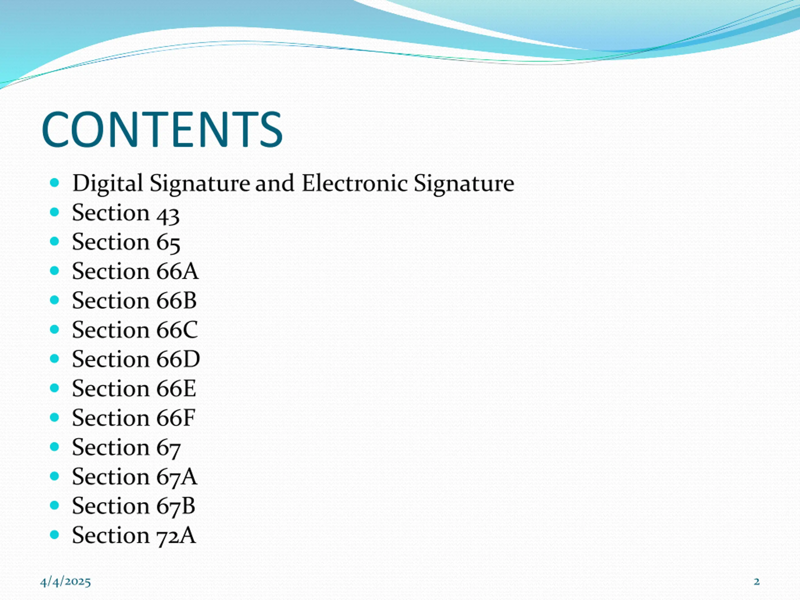 CONTENTS Digital Signature and Electronic Signature Section 43 Section 65 Section 66A Section 66B Section 66C Section 66D Section 66E Section 66F Section 67 Section 67A Section 67B Section 72A 4/4/2025 2