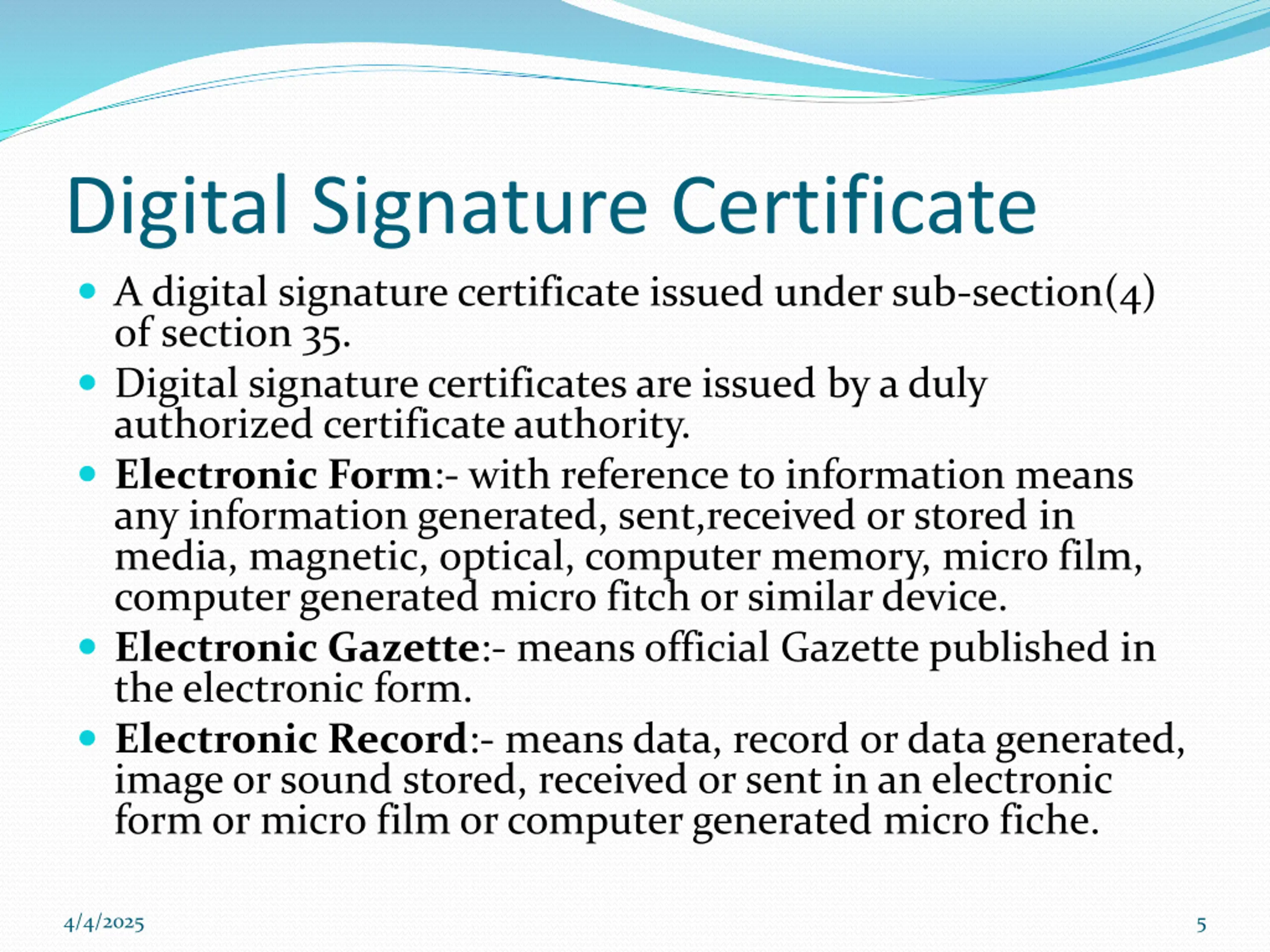 Digital Signature Certificate A digital signature certificate issued under sub-section(4) of section 35. Digital signature certificates are issued by a duly authorized certificate authority. Electronic Form:- with reference to information means any information generated, sent,received or stored in media, magnetic, optical, computer memory, micro film, computer generated micro fitch or similar device. Electronic Gazette:- means official Gazette published in the electronic form. Electronic Record:- means data, record or data generated, image or sound stored, received or sent in an electronic form or micro film or computer generated micro fiche. 4/4/2025 5