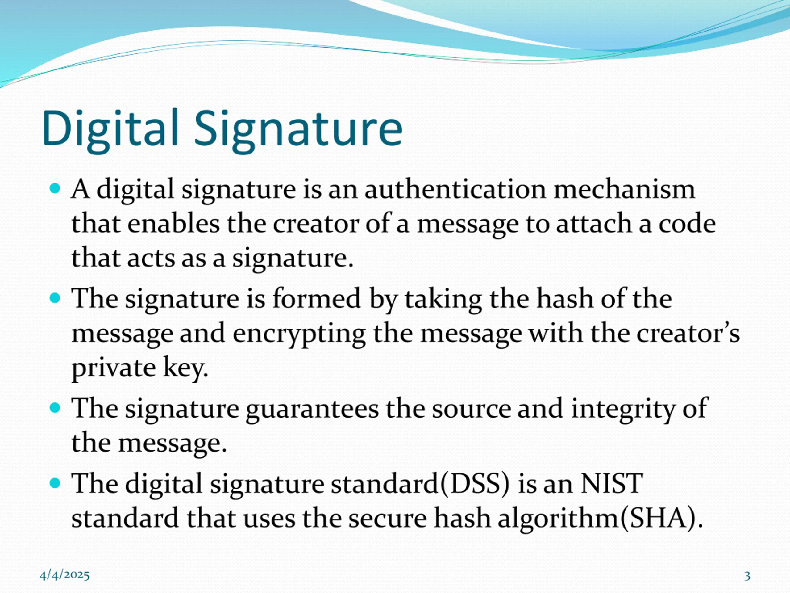 Digital Signature A digital signature is an authentication mechanism that enables the creator of a message to attach a code that acts as a signature. The signature is formed by taking the hash of the message and encrypting the message with the creator s private key. The signature guarantees the source and integrity of the message. The digital signature standard(DSS) is an NIST standard that uses the secure hash algorithm(SHA). 4/4/2025 3