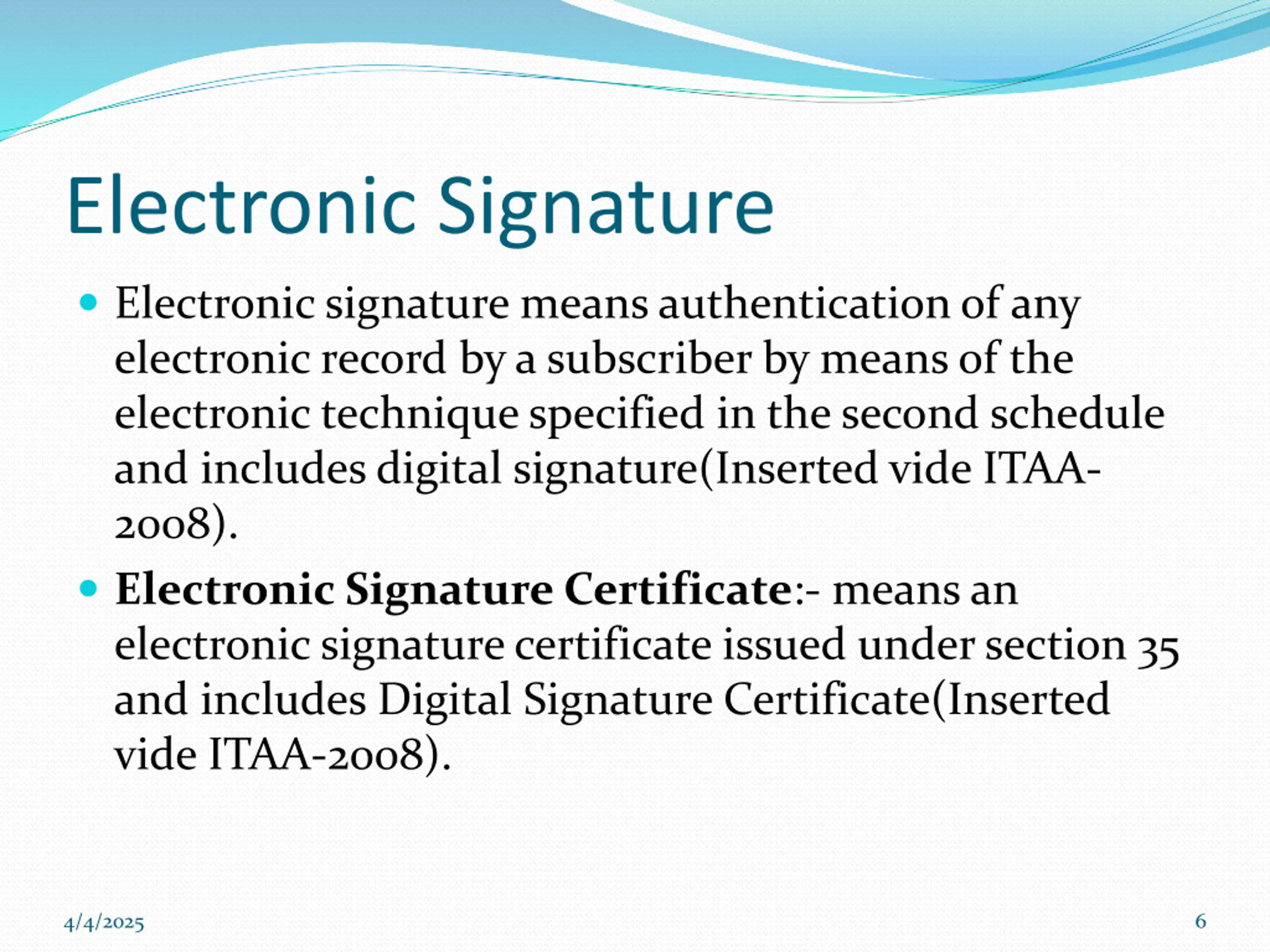 Electronic Signature Electronic signature means authentication of any electronic record by a subscriber by means of the electronic technique specified in the second schedule and includes digital signature(Inserted vide ITAA- 2008). Electronic Signature Certificate:- means an electronic signature certificate issued under section 35 and includes Digital Signature Certificate(Inserted vide ITAA-2008). 4/4/2025 6