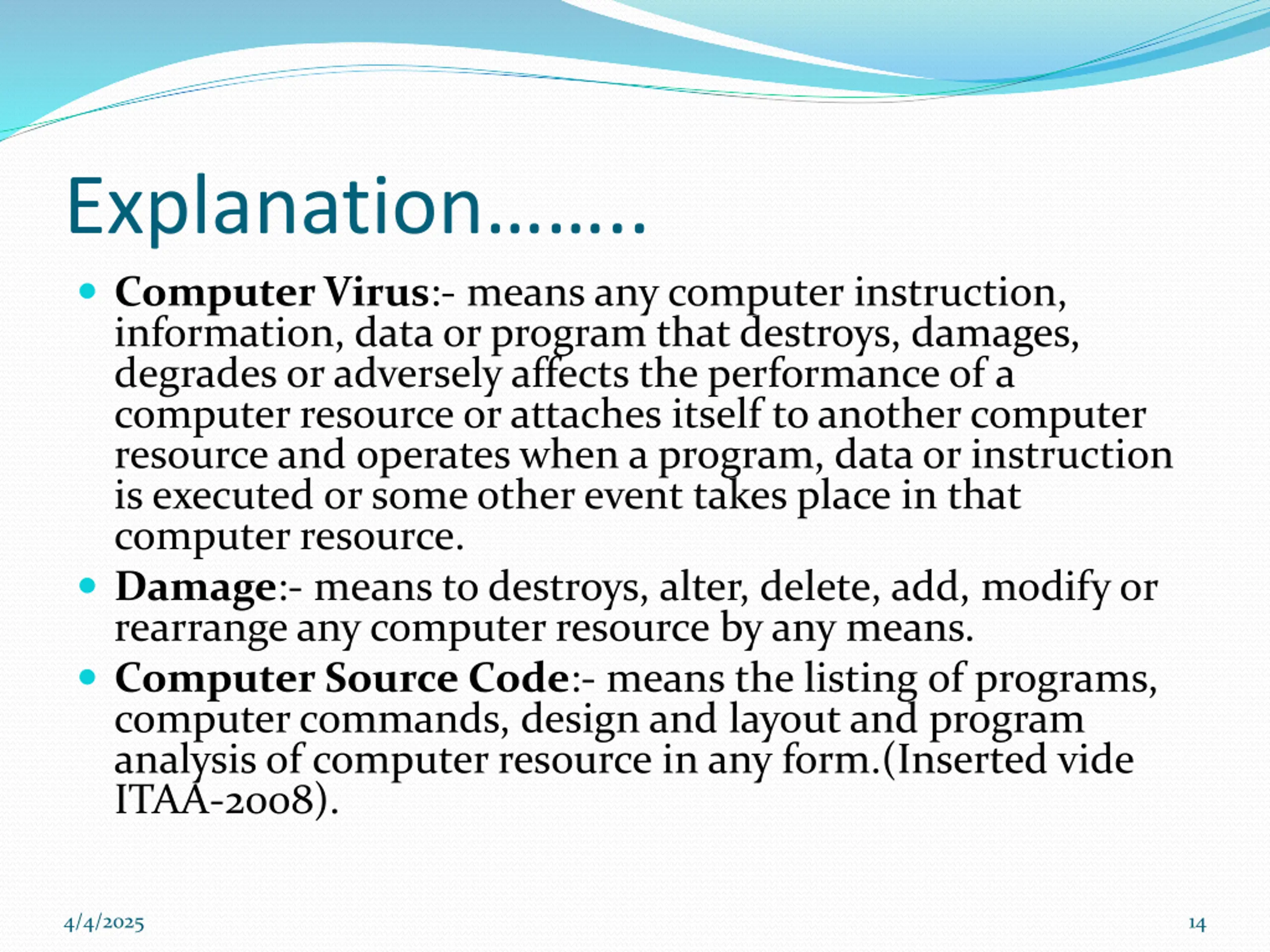 Explanation.. Computer Virus:- means any computer instruction, information, data or program that destroys, damages, degrades or adversely affects the performance of a computer resource or attaches itself to another computer resource and operates when a program, data or instruction is executed or some other event takes place in that computer resource. Damage:- means to destroys, alter, delete, add, modify or rearrange any computer resource by any means. Computer Source Code:- means the listing of programs, computer commands, design and layout and program analysis of computer resource in any form.(Inserted vide ITAA-2008). 4/4/2025 14
