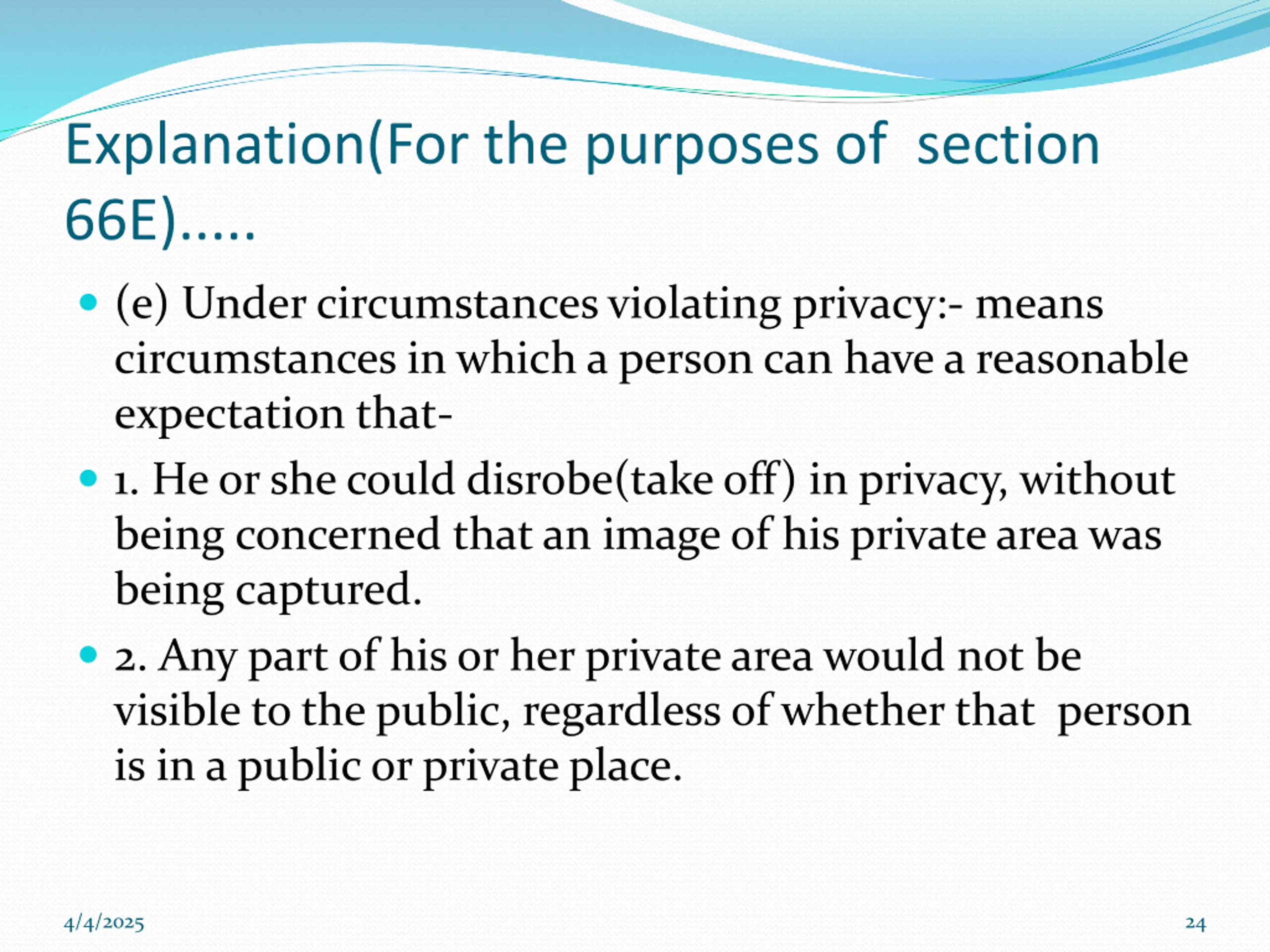 Explanation(For the purposes of section 66E)..... (e) Under circumstances violating privacy:- means circumstances in which a person can have a reasonable expectation that- 1. He or she could disrobe(take off) in privacy, without being concerned that an image of his private area was being captured. 2. Any part of his or her private area would not be visible to the public, regardless of whether that person is in a public or private place. 4/4/2025 24