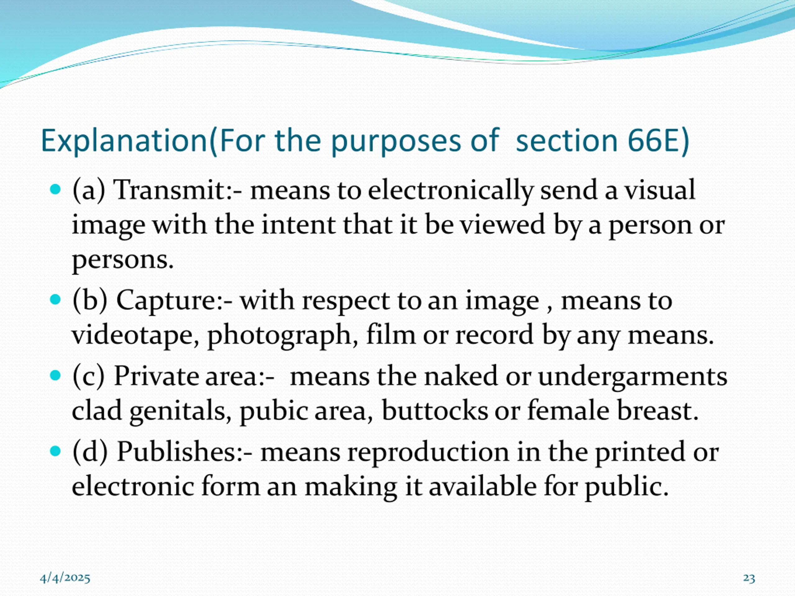 Explanation(For the purposes of section 66E) (a) Transmit:- means to electronically send a visual image with the intent that it be viewed by a person or persons. (b) Capture:- with respect to an image , means to videotape, photograph, film or record by any means. (c) Private area:- means the naked or undergarments clad genitals, pubic area, buttocks or female breast. (d) Publishes:- means reproduction in the printed or electronic form an making it available for public. 4/4/2025 23