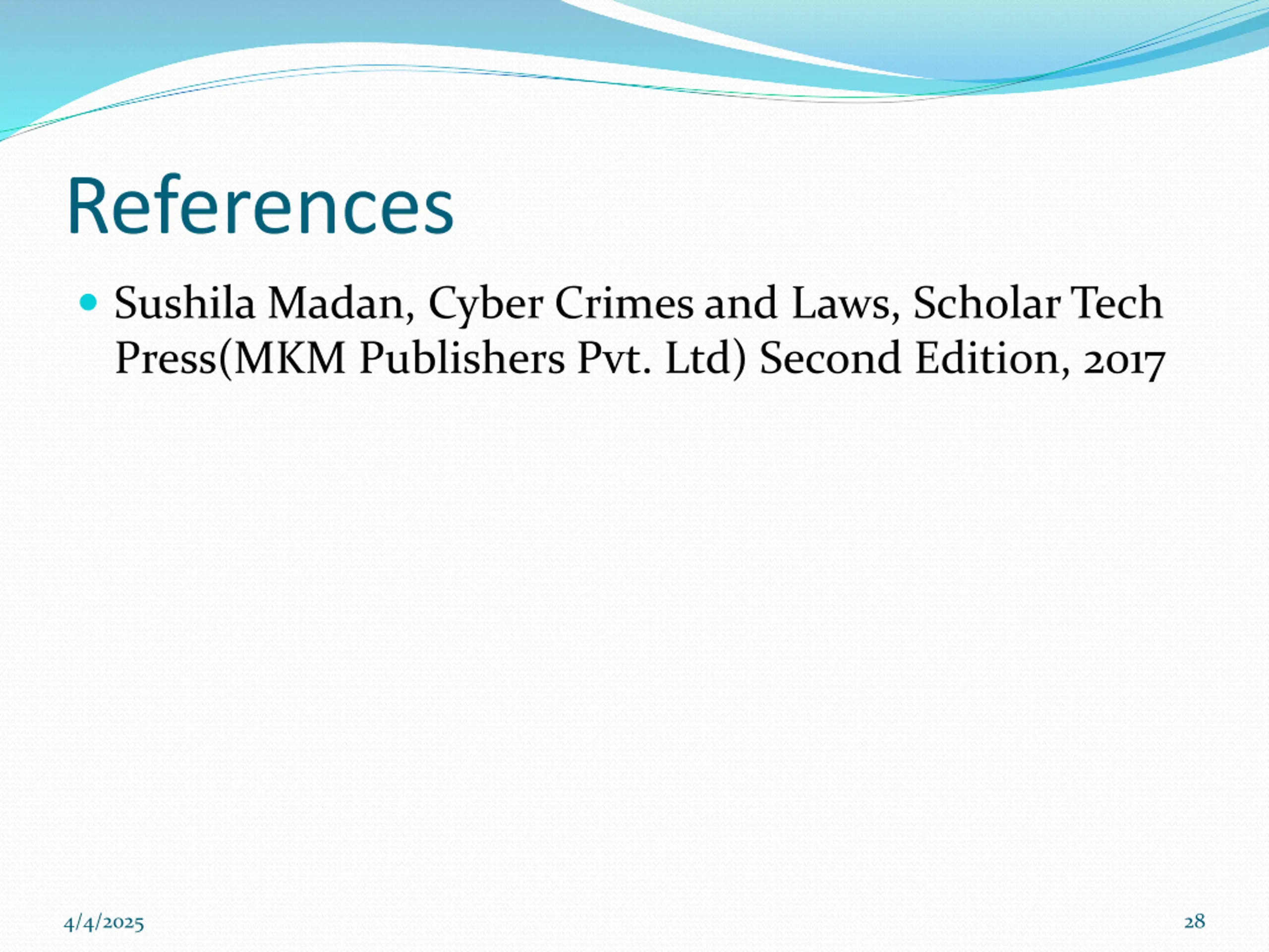 References Sushila Madan, Cyber Crimes and Laws, Scholar Tech Press(MKM Publishers Pvt. Ltd) Second Edition, 2017 4/4/2025 28