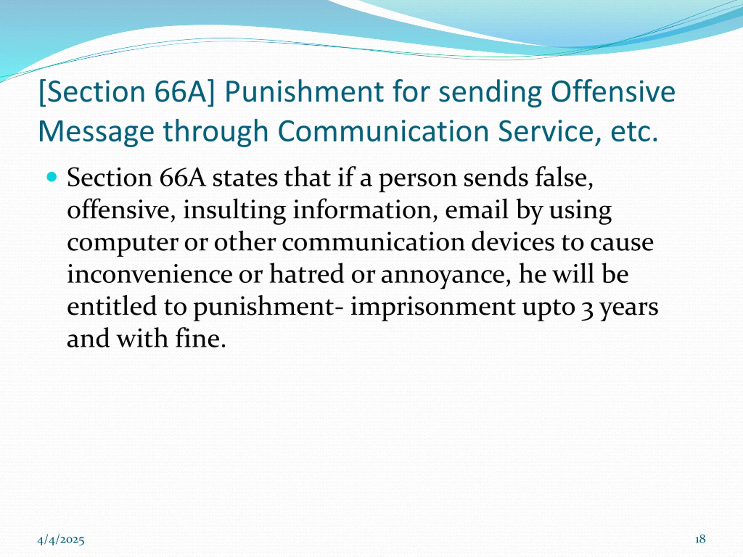[Section 66A] Punishment for sending Offensive Message through Communication Service, etc. Section 66A states that if a person sends false, offensive, insulting information, email by using computer or other communication devices to cause inconvenience or hatred or annoyance, he will be entitled to punishment- imprisonment upto 3 years and with fine. 4/4/2025 18