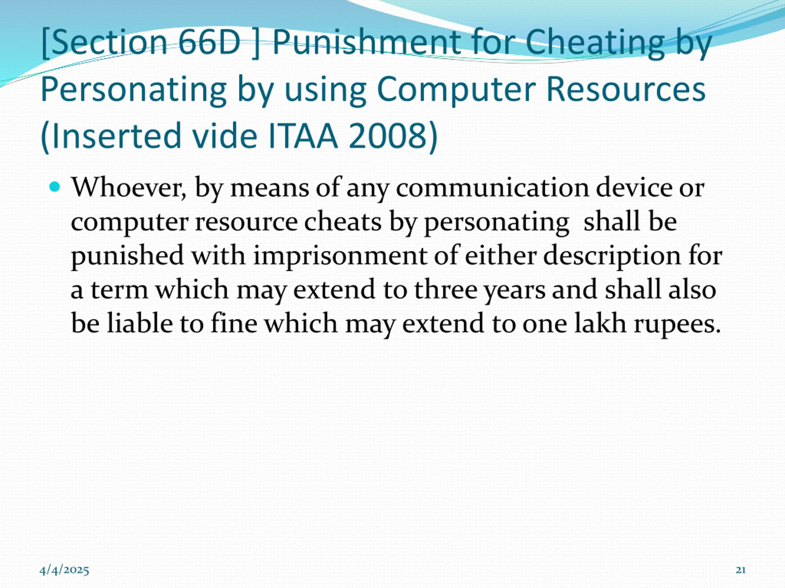 [Section 66D ] Punishment for Cheating by Personating by using Computer Resources (Inserted vide ITAA 2008) Whoever, by means of any communication device or computer resource cheats by personating shall be punished with imprisonment of either description for a term which may extend to three years and shall also be liable to fine which may extend to one lakh rupees. 4/4/2025 21
