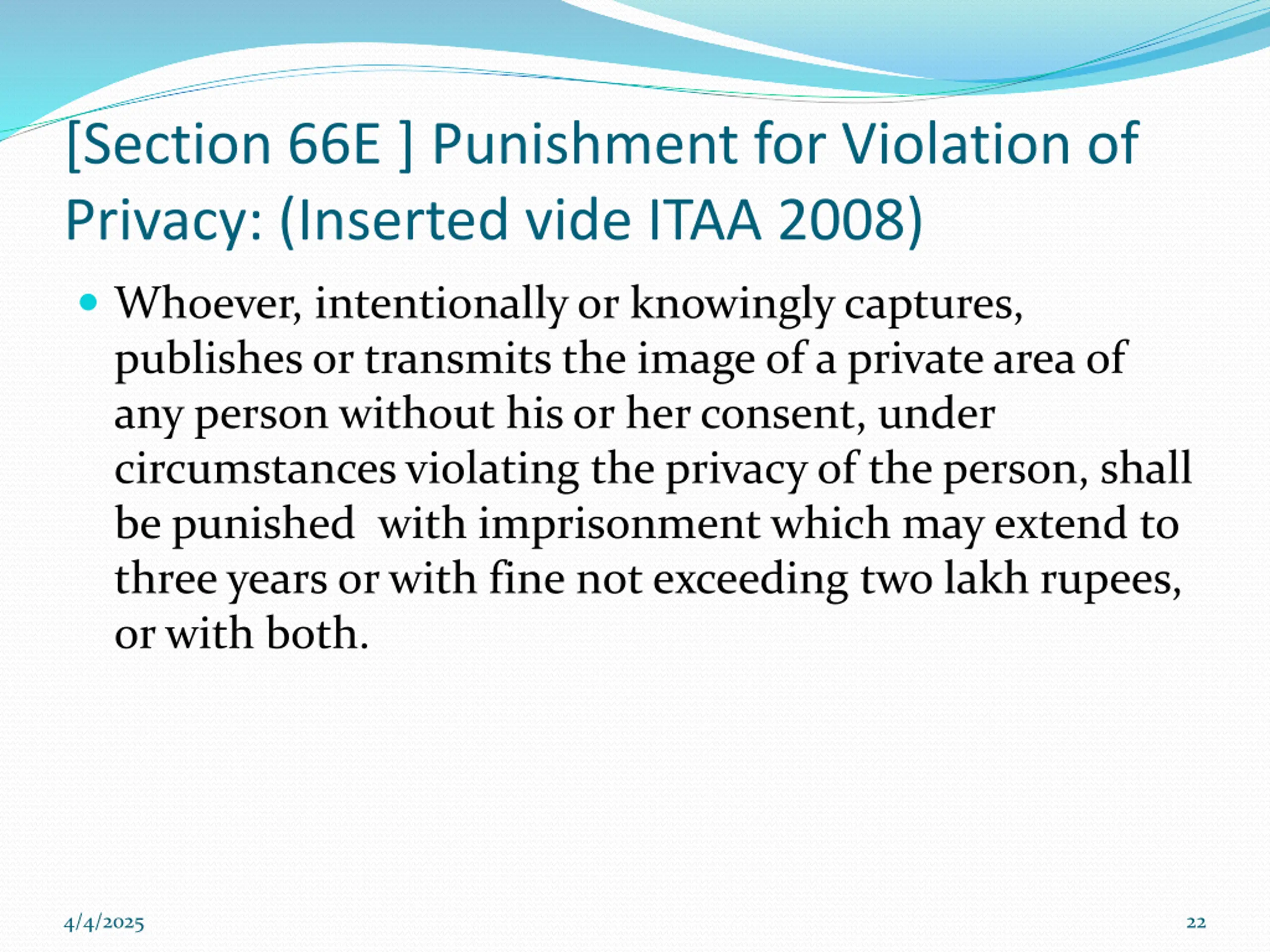 [Section 66E ] Punishment for Violation of Privacy: (Inserted vide ITAA 2008) Whoever, intentionally or knowingly captures, publishes or transmits the image of a private area of any person without his or her consent, under circumstances violating the privacy of the person, shall be punished with imprisonment which may extend to three years or with fine not exceeding two lakh rupees, or with both. 4/4/2025 22