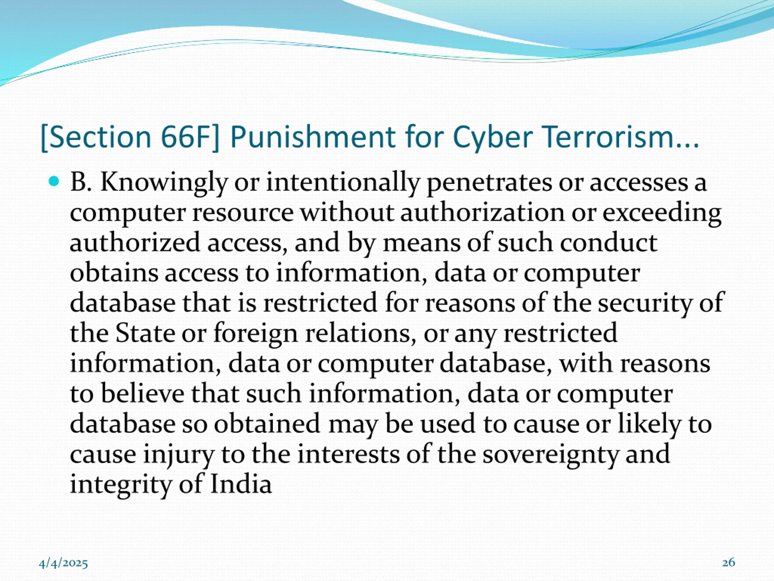 [Section 66F] Punishment for Cyber Terrorism... B. Knowingly or intentionally penetrates or accesses a computer resource without authorization or exceeding authorized access, and by means of such conduct obtains access to information, data or computer database that is restricted for reasons of the security of the State or foreign relations, or any restricted information, data or computer database, with reasons to believe that such information, data or computer database so obtained may be used to cause or likely to cause injury to the interests of the sovereignty and integrity of India 4/4/2025 26